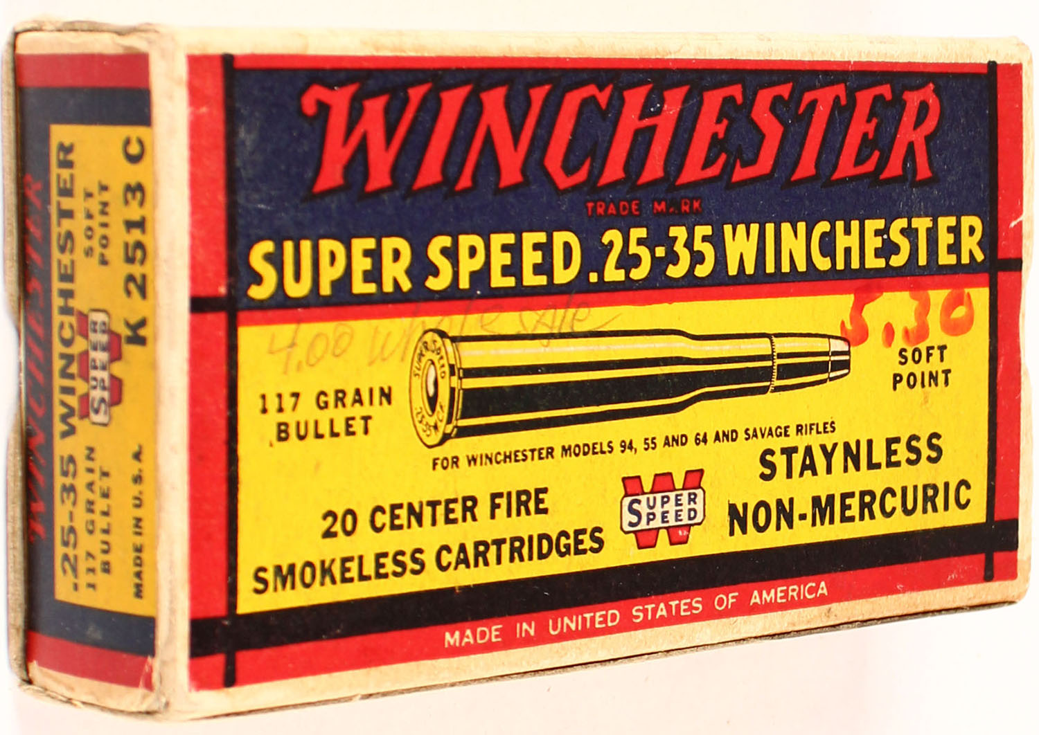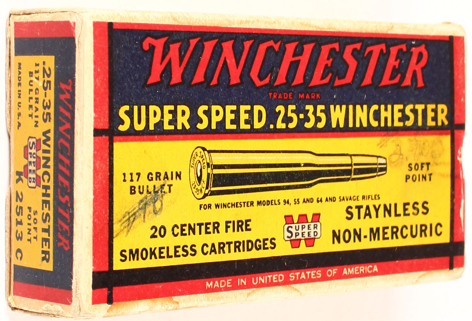 Winchester, Super Speed, .25-35 Winchester, 117 Grain Soft Point Bullet, Full, 1pc. Yellow blue & red box, box is solid with excellent color, very minor age soiling, some staining, top & bottom have been written on, corner wear, minor edge wear, end flaps are solid, ammo is excellent. Grade: Excellent - Value: 50 to 150
