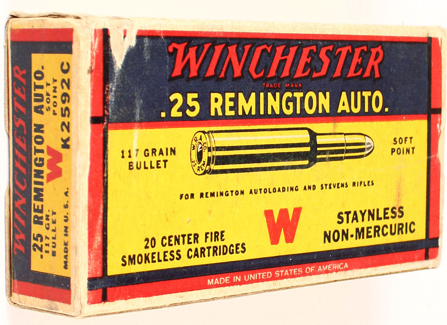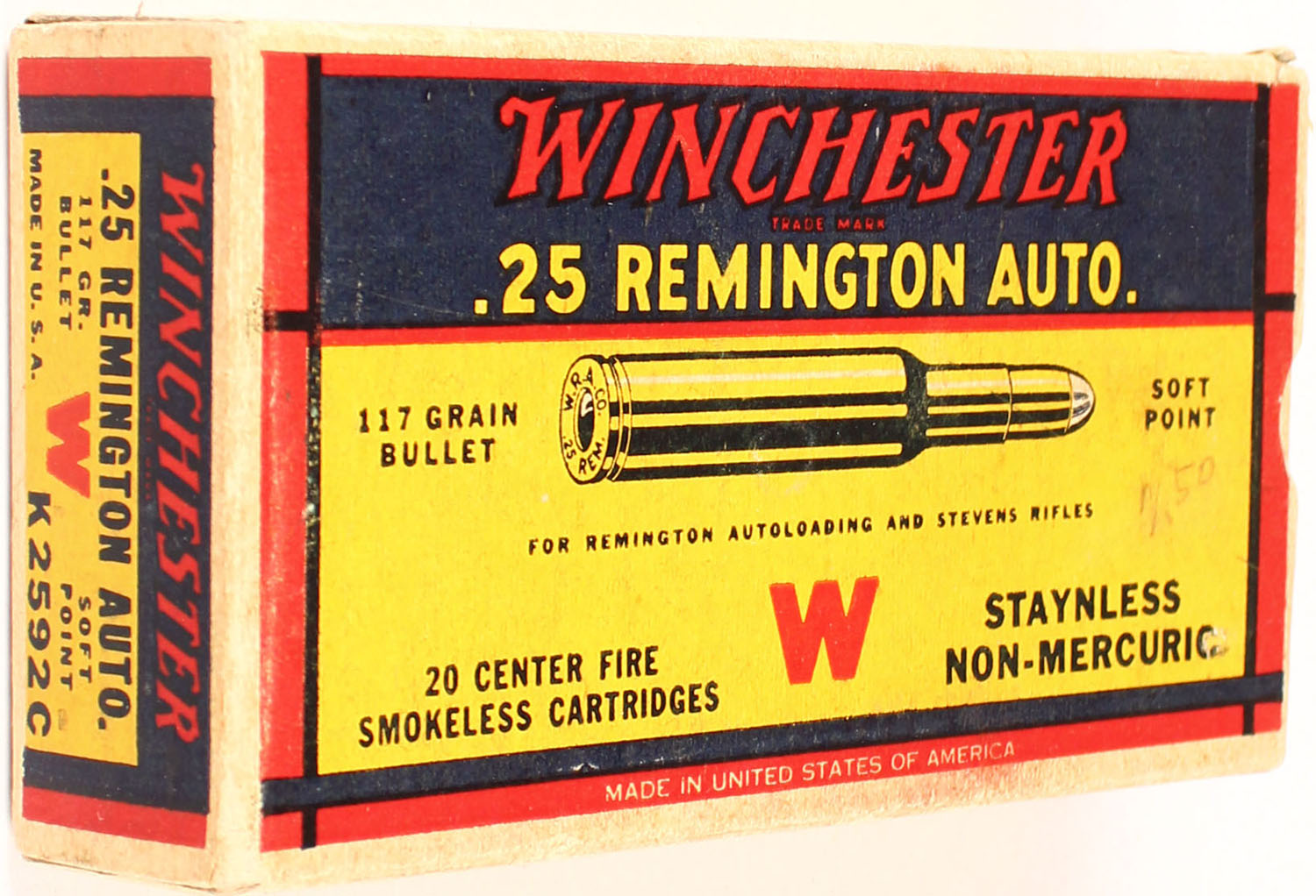 Winchester, .25 Remington Autoloading, 117 Grain Soft Point Bullet, Full, 1pc. Yellow blue & red box, box is solid with very good to excellent color, very minor age soiling & shelf wear, very minor corner wear, edges are mostly crisp, end flaps are solid, top has been written on, ammo is excellent. Grade: Excellent - Value: 20 to 60