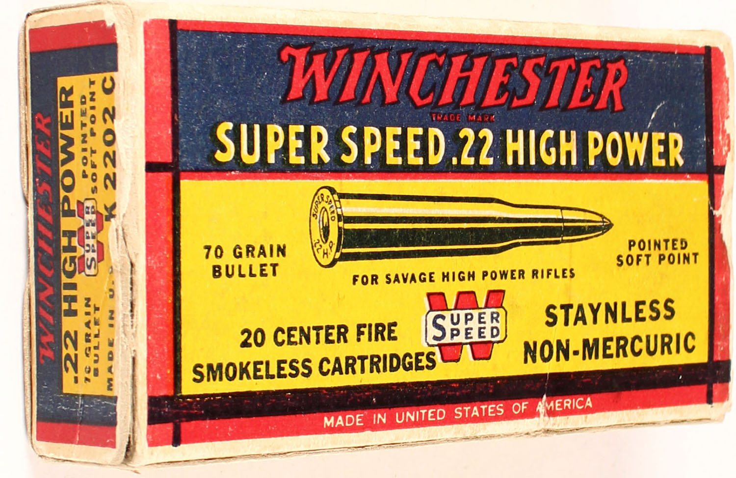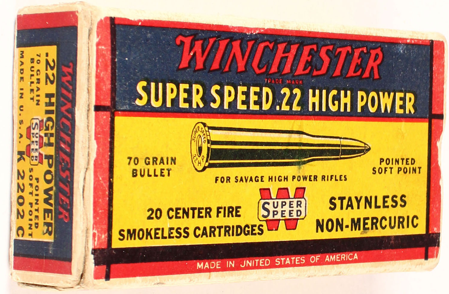 Winchester, Super Speed, .22 High Power, 70 Grain Pointed Soft Point Bullet, Full, 1pc. Yellow blue & red box, box is solid with excellent color, some age soiling, edge ding on bottom front edge, partial seam splits to both end flaps, minor staining & shelf wear, some edge & corner wear, ammo is excellent. Grade: Excellent - Value: 50 to 150