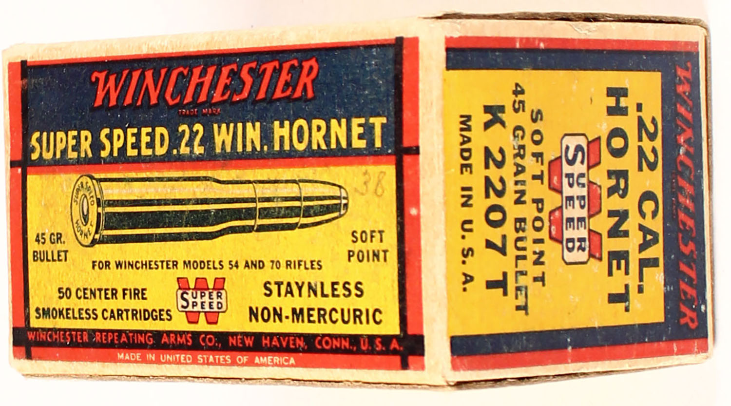 Winchester, Super Speed, .22 Win. Hornet, 45 Gr. Soft Point Bullet, Full, 1pc. Yellow blue & red box, box is solid with excellent color, minor age soiling & shelf wear, corners are somewhat sharp, edges are crisp, end flaps are solid, bottom has been written on, ammo is excellent. Grade: Excellent + - Value: 100 to 300