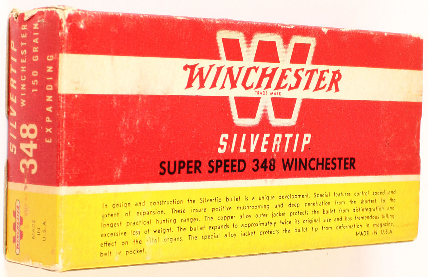 Winchester, Silvertip, .348 Winchester, 150 Grain Controlled Expanding Bullet, Full, 1pc. Red yellow & white box, box is solid with excellent color, some age soiling, very minor shelf wear, minor corner wear, edges are mostly crisp, end flaps are solid, ammo is excellent. Grade: Excellent + - Value: 30 to 90