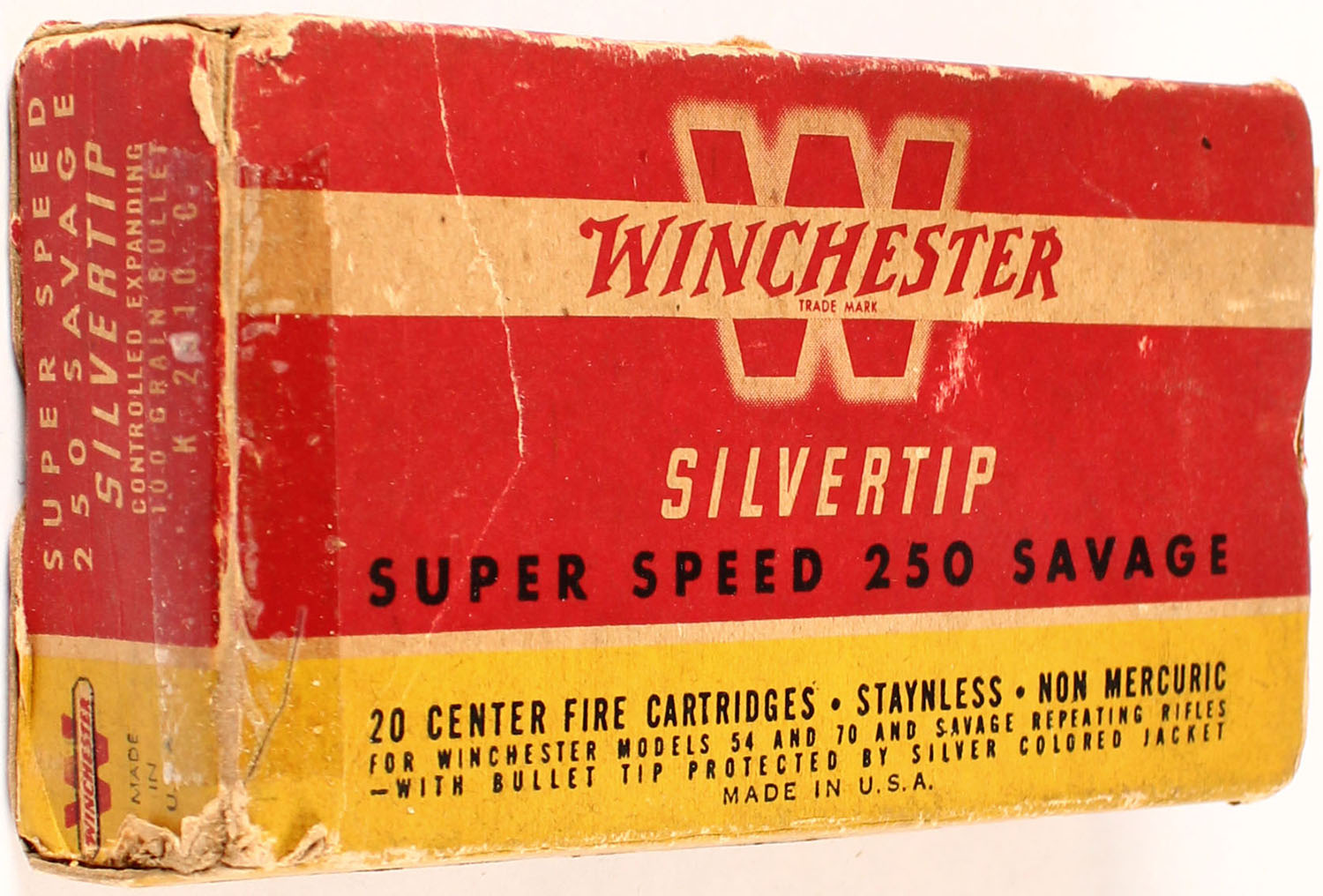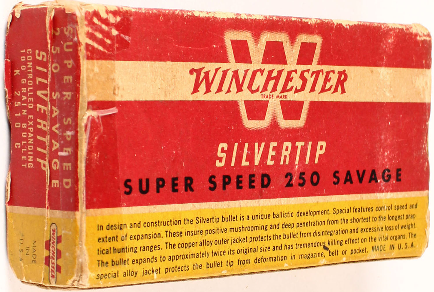 Winchester, Silvertip, .250 Savage, 150 Grain Controlled Expanding Bullet, Full, 1pc. Red yellow & white box, box is solid with good color, age soiling, minor shelf wear, both end flaps are torn & taped, corner wear, very minor edge wear, ammo is excellent to minty. Grade: Very Good - Value: 10 to 50