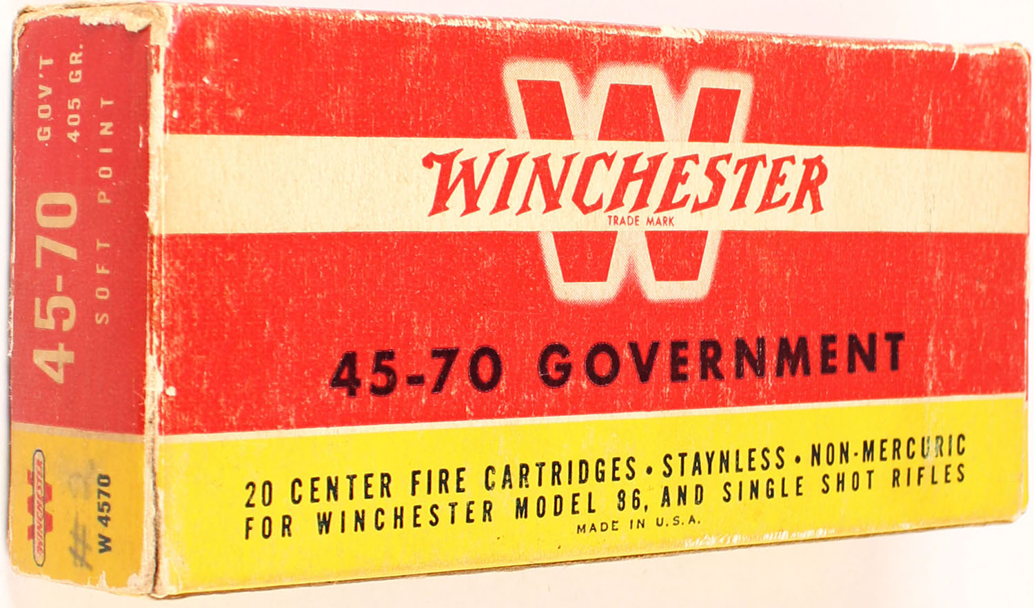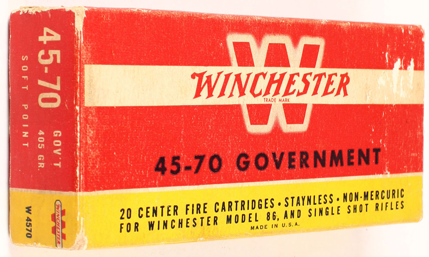 Winchester, .45-70 Government, 405 Grain Soft Point, Full of Mixed Ammo, 1pc. Red yellow & white box, box is solid with very good color, some age soiling & shelf wear, minor corner wear, very minor edge wear, end flaps are solid, ammo is excellent. Grade: Excellent - Value: 20 to 60