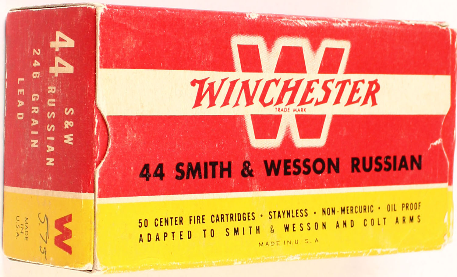 Winchester, .44 Smith & Wesson Russian, 246 Grain Lead Bullet, Full, 1pc. Red yellow & white box, box is solid with excellent color, very minor age soiling, minor shelf wear, very minor corner & edge wear, end flaps are solid, ammo is excellent. Grade: Excellent - Value: 50 to 150
