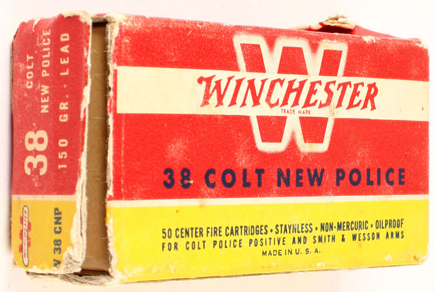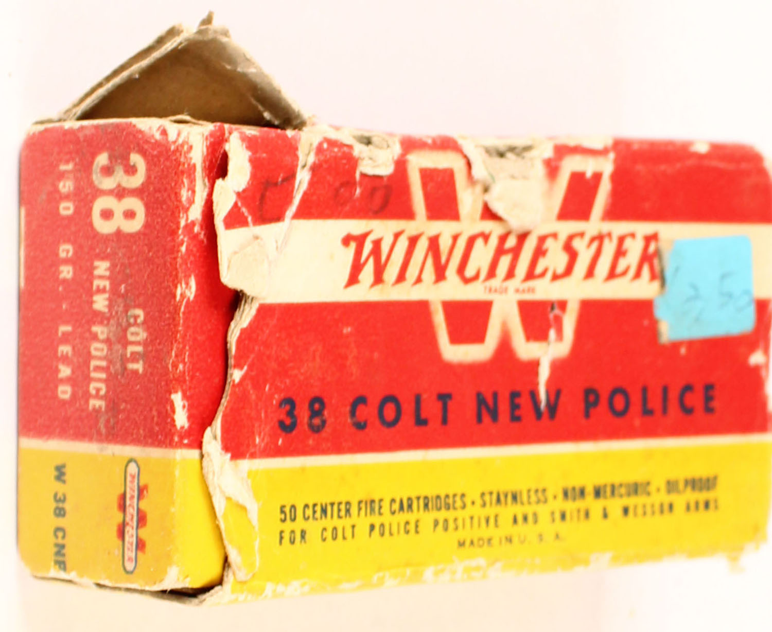 Winchester, .38 Colt New Police, 150 Grain Lead Bullet, Full, 1pc. Red yellow & white box, right end flap is torn, top and back side are all chewed up , edge wear, corner wear, sticker on top, ammo is good to very good. Grade: Good - Value: 10 to 50