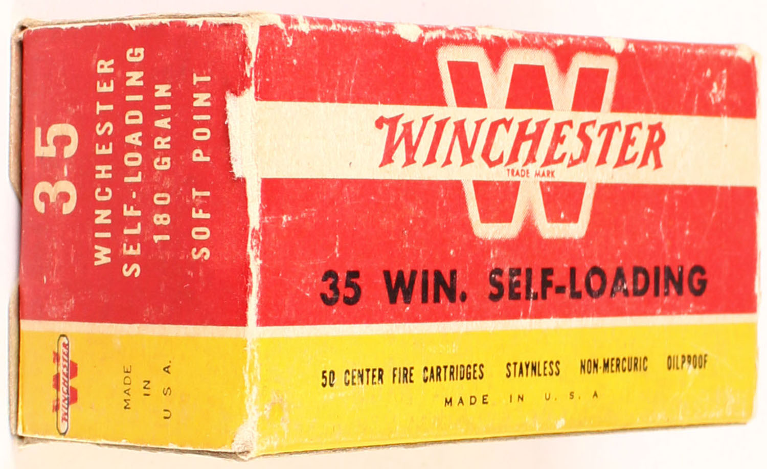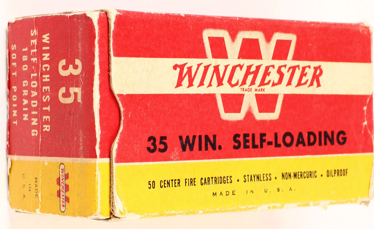 Winchester, .35 Win. Self-Loading, 180 Grain Soft Point, Full, 1pc. Red yellow & white box, box is solid with excellent color, minor age soiling, some edge & corner wear, end flaps are solid, ammo is very good to excellent. Grade: Excellent - Value: 50 to 400
