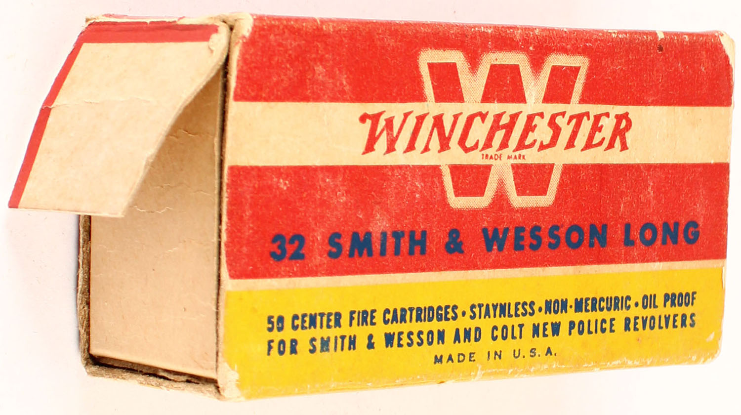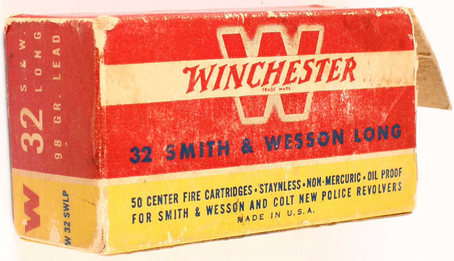 Winchester, .32 Smith & Wesson Long, 98 Grain Lead Bullet, Partial 44rds. 1pc. Red yellow & white box, box is missing left end flap, very good color, age soiling, some edge & corner wear, right end flap is solid, ammo is excellent. Grade: Good ++ - Value: 10 to 40