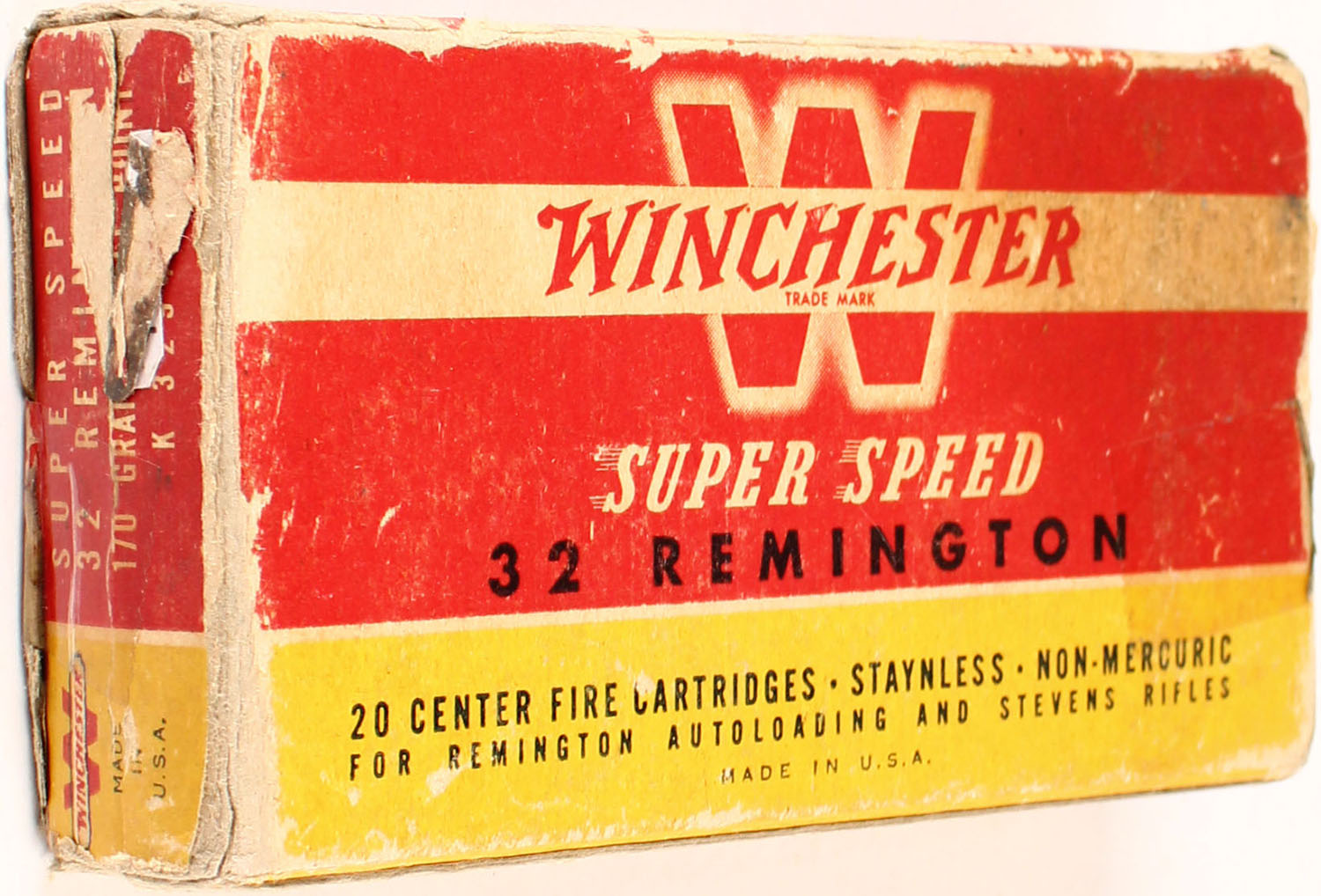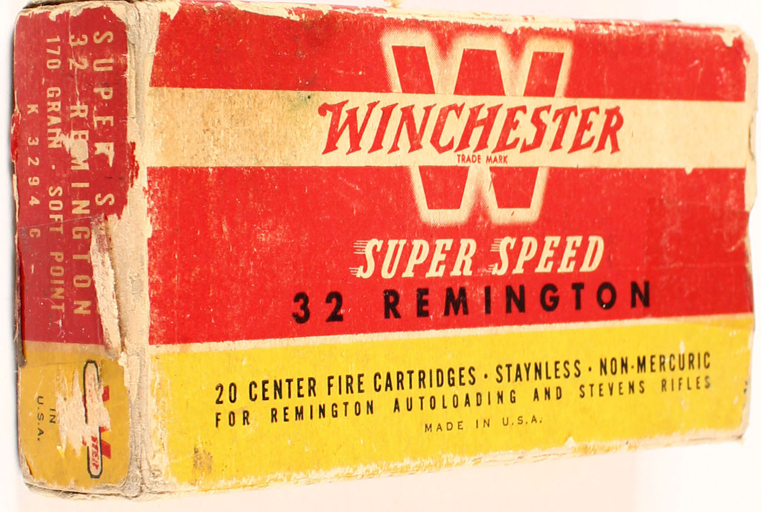 Winchester, Super Speed, .32 Remington, 170 Grain Soft Point, Full, 1pc. Red yellow & white box, box is solid with good color, age soiling, color fading, stain to left end on top & bottom, edge & corner wear, both end flaps are taped, ammo is excellent. Grade: Very Good - Value: 20 to 60
