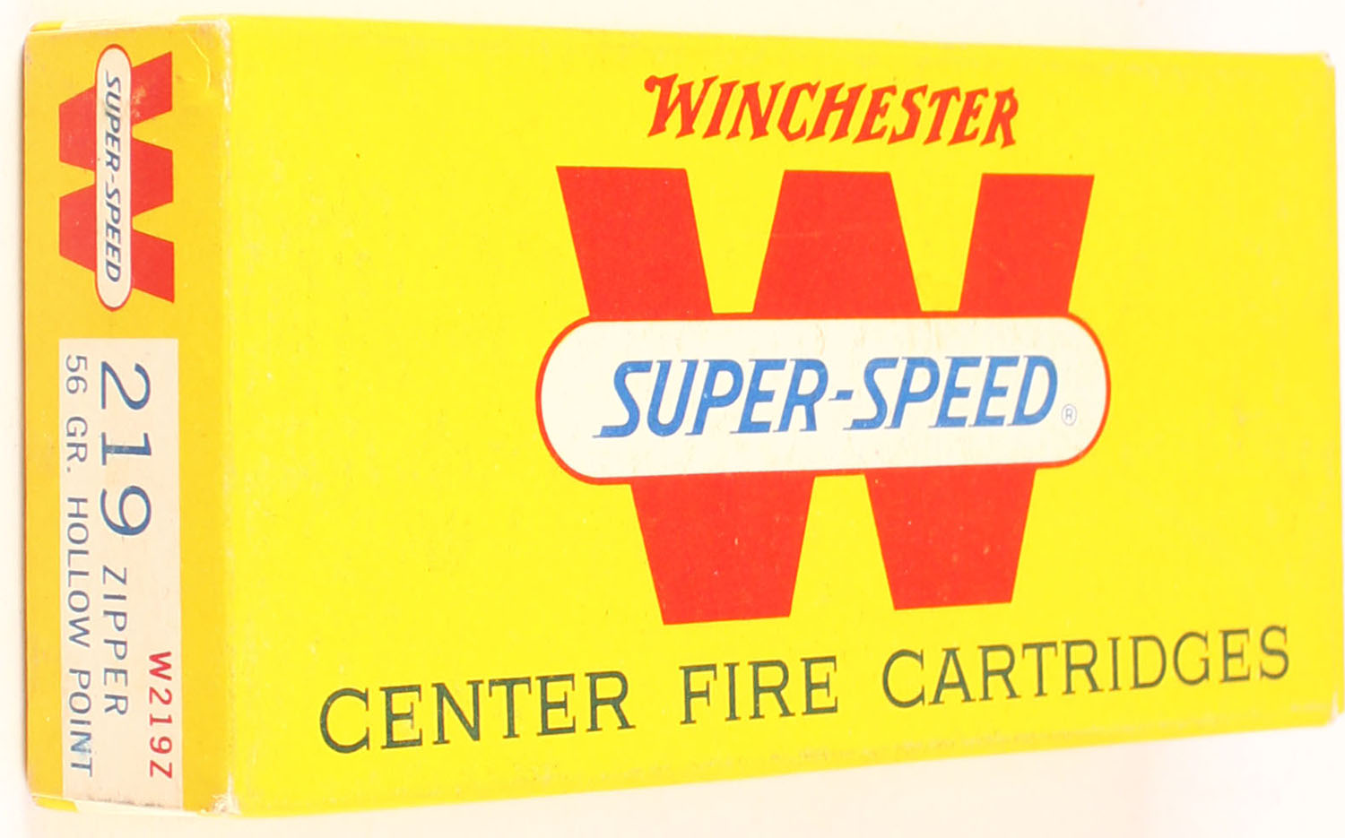 Winchester, Super-Speed, .219 Zipper, 56 Grain Hollow Point, Full, 1pc. Yellow white & red box, box is solid with excellent color, only very minor age soiling & shelf wear, corners are mostly sharp, edges are crisp, end flaps are solid, ammo is excellent. Grade: Excellent ++ - Value: 200 to 600