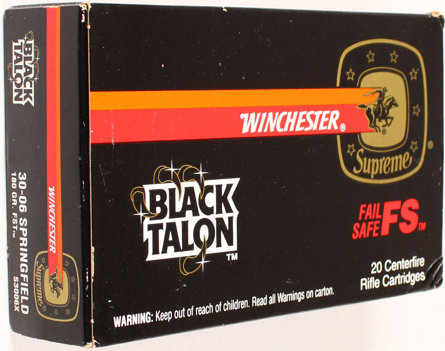 Winchester, Supreme Black Talon, 30-06 Springfield, 180 Grain FST, Full, 1pc., Multi-colored box, box is solid with great color, Ammo is excellent. Grade: Excellent ++ - Value: 20 to 80