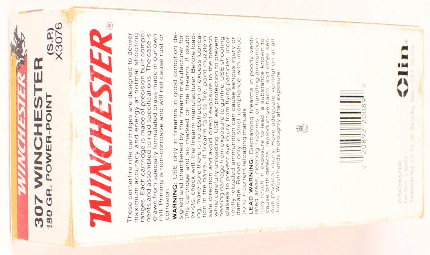 Winchester, Super-X, 307 Winchester, 180 Grain Power-point SP, Full, 1pc., Multi-colored box, box is solid with great color, Ammo is excellent. Grade: Excellent ++ - Value: 20 to 80