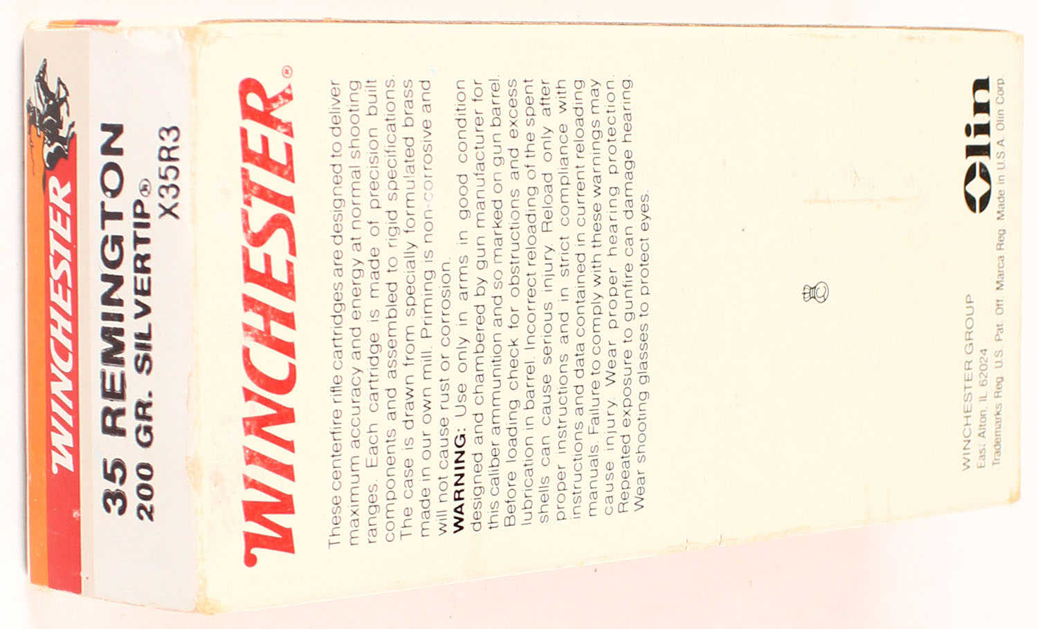 Winchester, Super-X, 35 Remington, 200 Grain Silvertip, Full, 1pc., Multi-colored box, box is solid with great color, Ammo is excellent. Grade: Excellent ++ - Value: 20 to 80