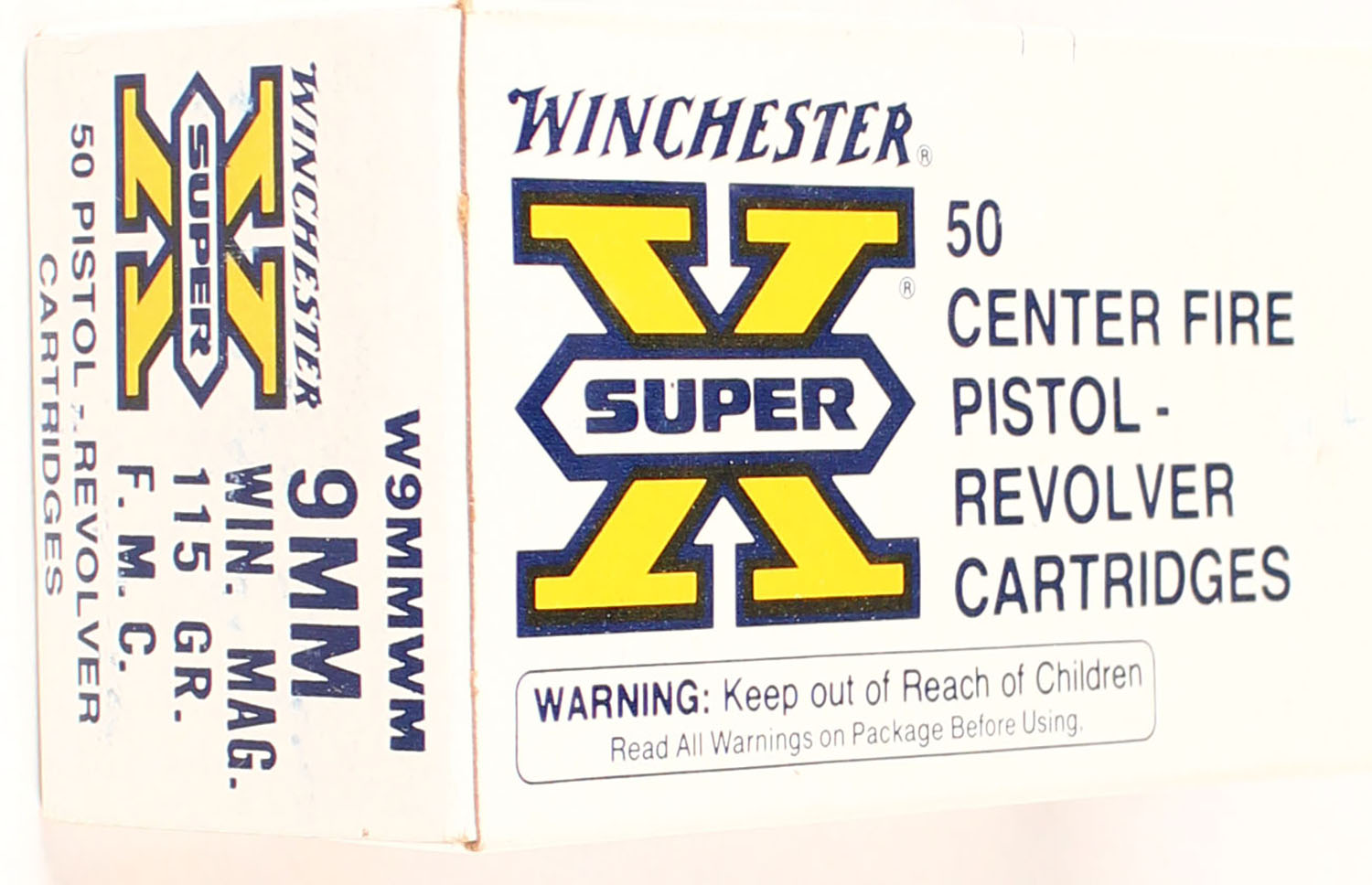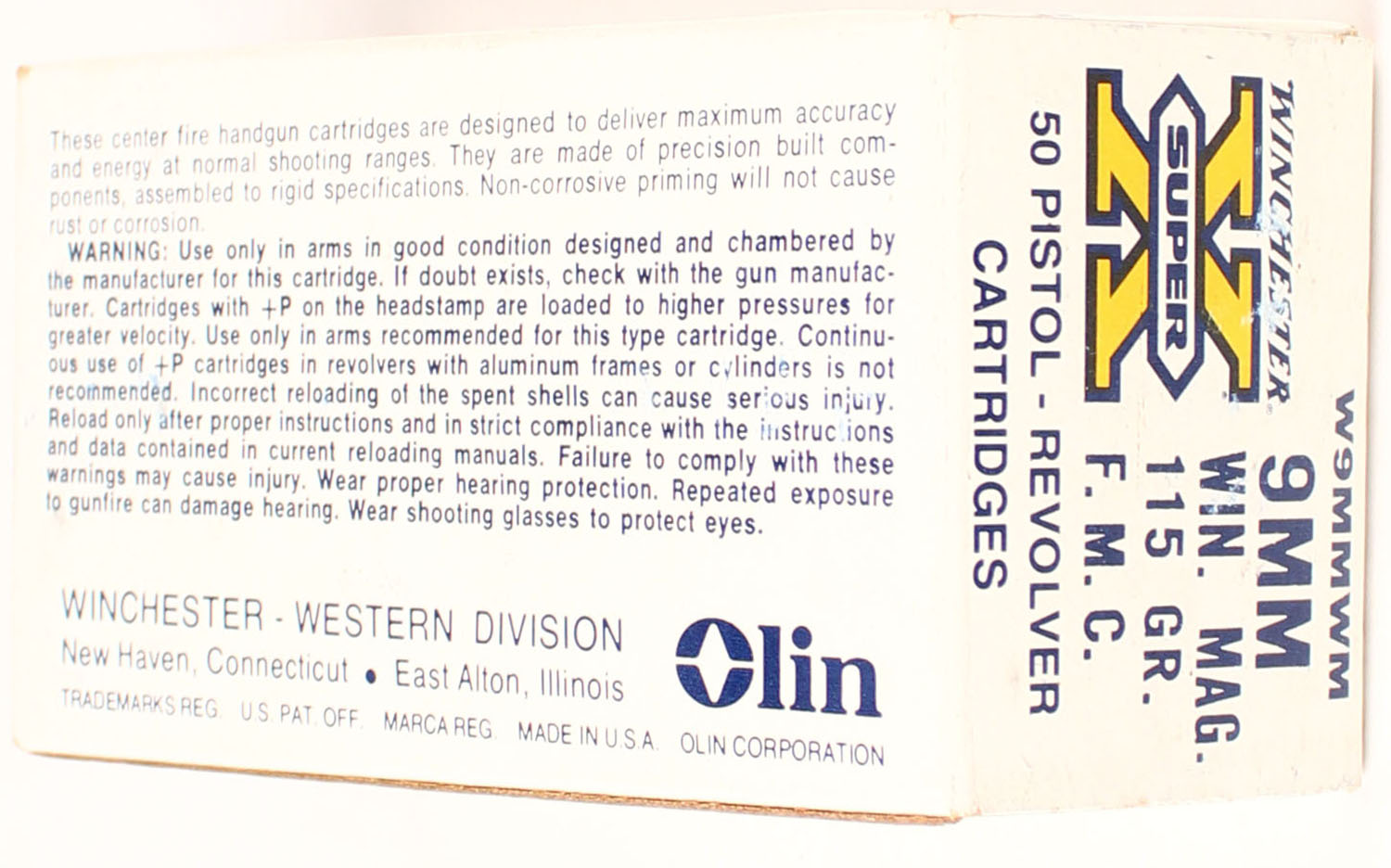 Winchester, Super-X, 9mm Win Mag, 115 Grain FMC, Full, 1pc., Multi-colored box, box is solid with great color, Ammo is excellent. Grade: Excellent ++ - Value: 20 to 80