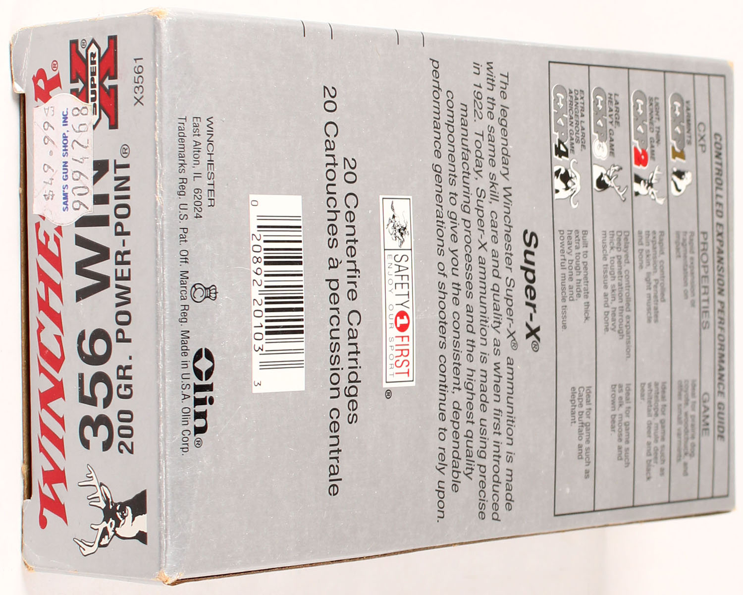 Winchester, Super-X, 356 Win, 200 Grain Power-Point, Full, 1pc., Multi-colored box, box is solid with great color, Ammo is excellent. Grade: Excellent + - Value: 20 to 80