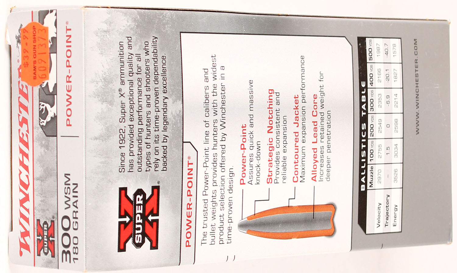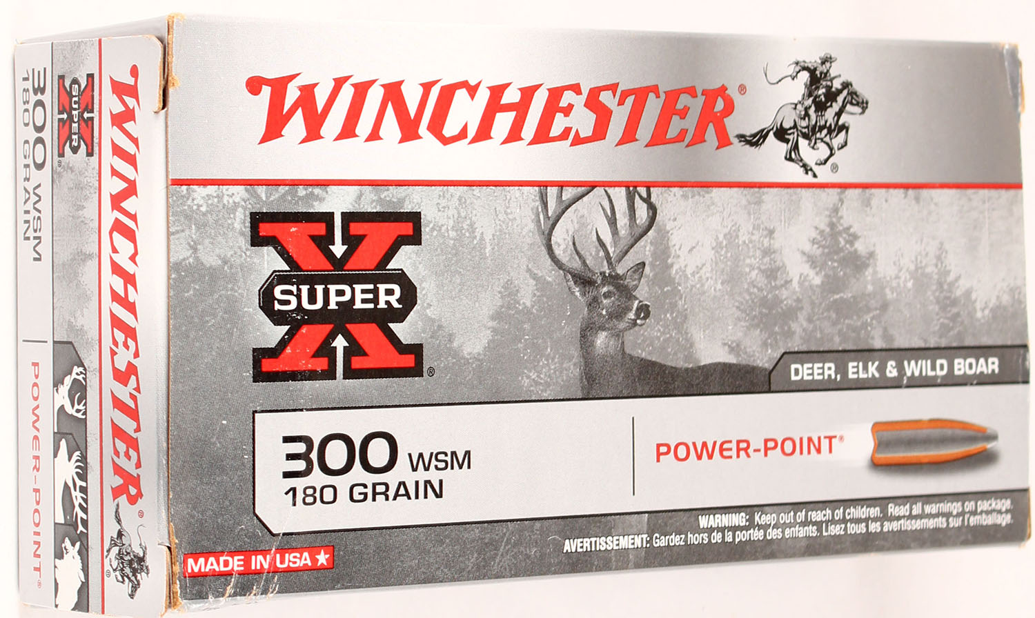 Winchester, Super-X, 300 WSM, 180 Grain Power-Point, Full, 1pc., Multi-colored box, box is solid with great color, Ammo is excellent. Grade: Excellent + - Value: 20 to 80
