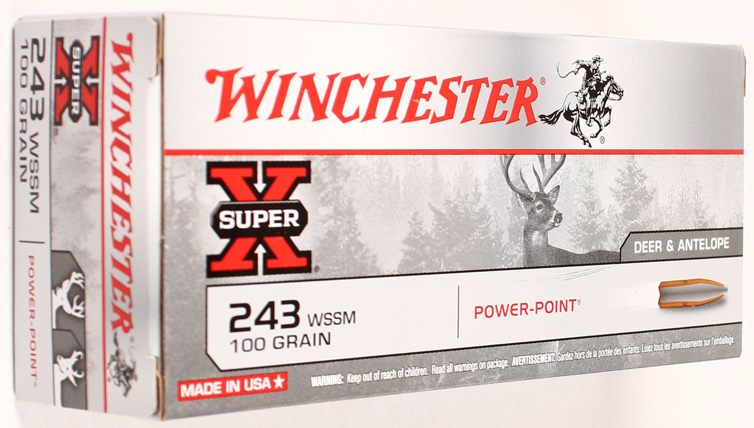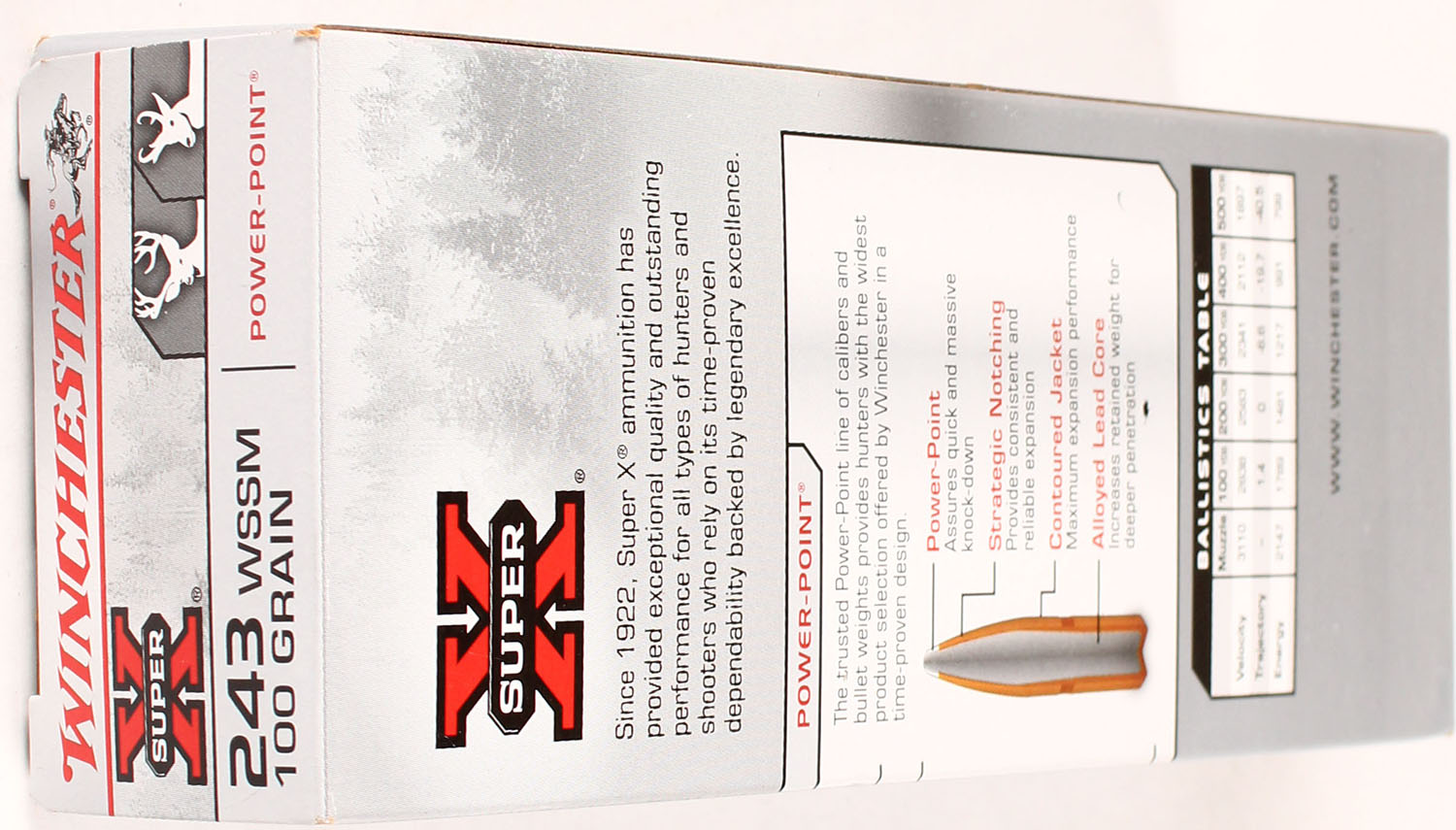 Winchester, Super-X, 243 WSSM, 100 Grain Power-Point, Full, 1pc., Multi-colored box, box is solid with great color, Ammo is excellent. Grade: Excellent + - Value: 20 to 80