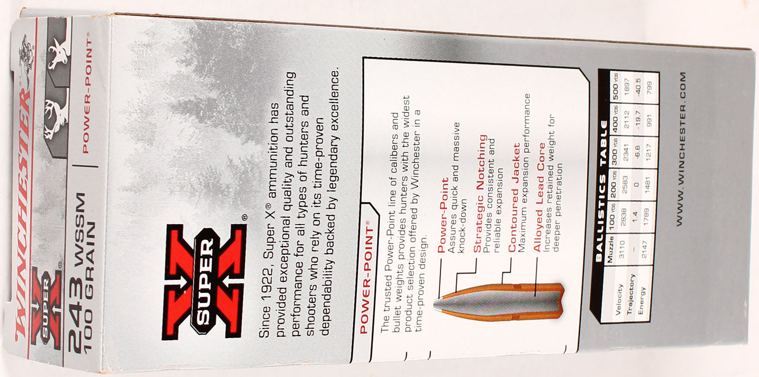 Winchester, Super-X, 243 WSSM, 100 Grain Power-Point, Full, 1pc., Multi-colored box, box is solid with great color, Ammo is excellent. Grade: Excellent + - Value: 20 to 80