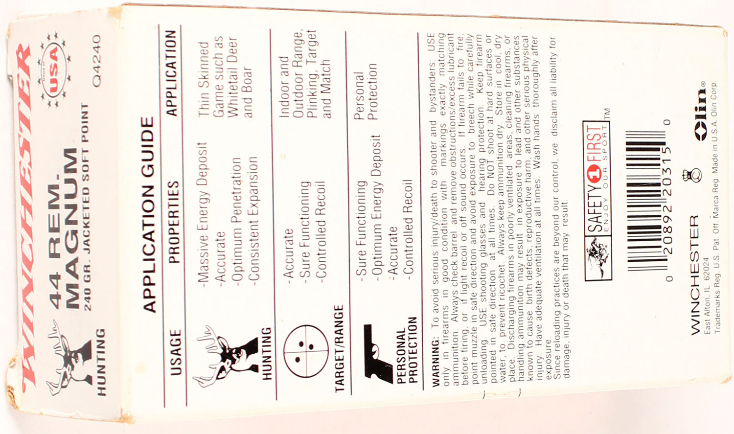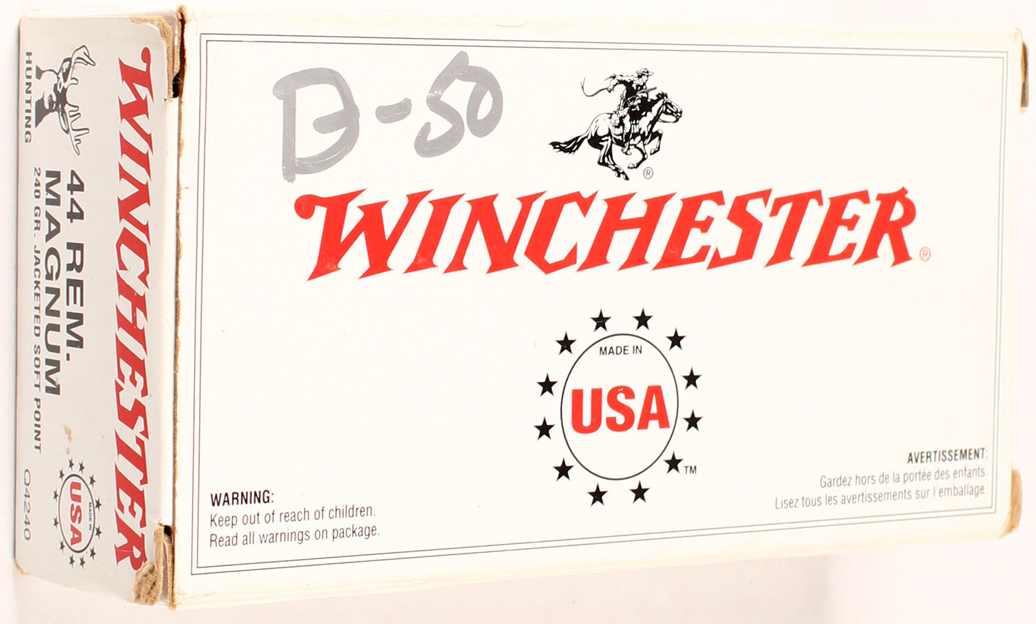 Winchester, 44 Rem Mag, 240 Grain Jacketed Soft Point, Full, 1pc., Multi-colored box, box is solid with great color, Ammo is excellent. Grade: Excellent + - Value: 20 to 80