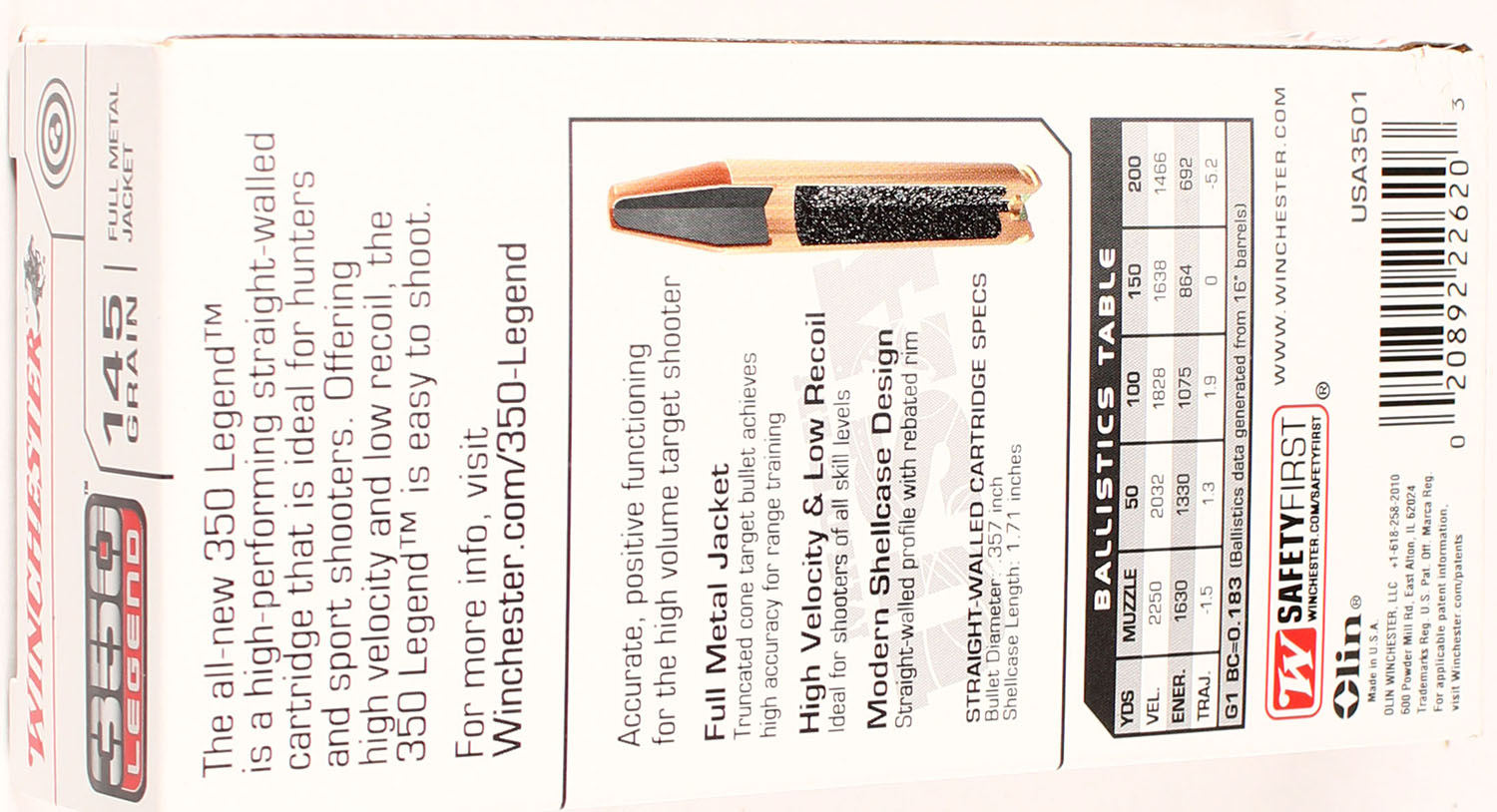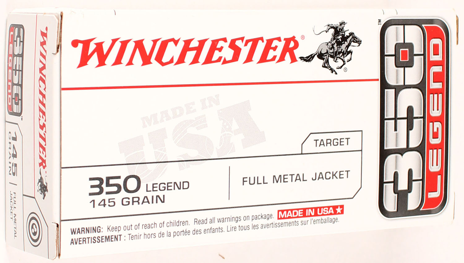 Winchester, 350 Legend, 145 Grain FMJ, Full, 1pc., Multi-colored box, box is solid with great color, Ammo is excellent. Grade: Excellent + - Value: 20 to 80