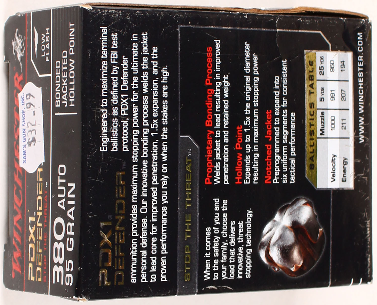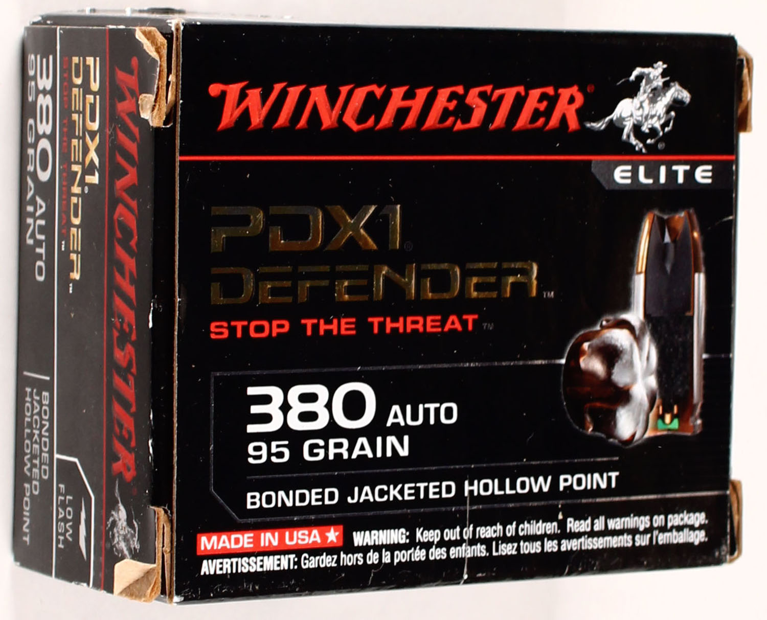 Winchester Elite, PDX1 Defender, 380 Auto, 95 Grain Bonded Jacketed HP, Full, 1pc., Multi-colored box, box is solid with great color, Ammo is excellent. Grade: Excellent + - Value: 20 to 80