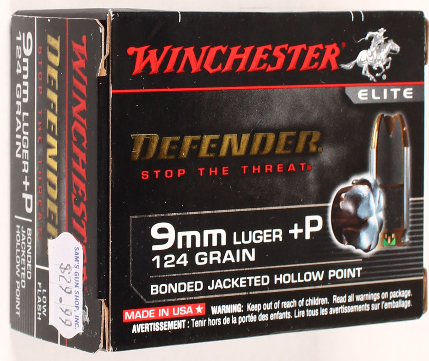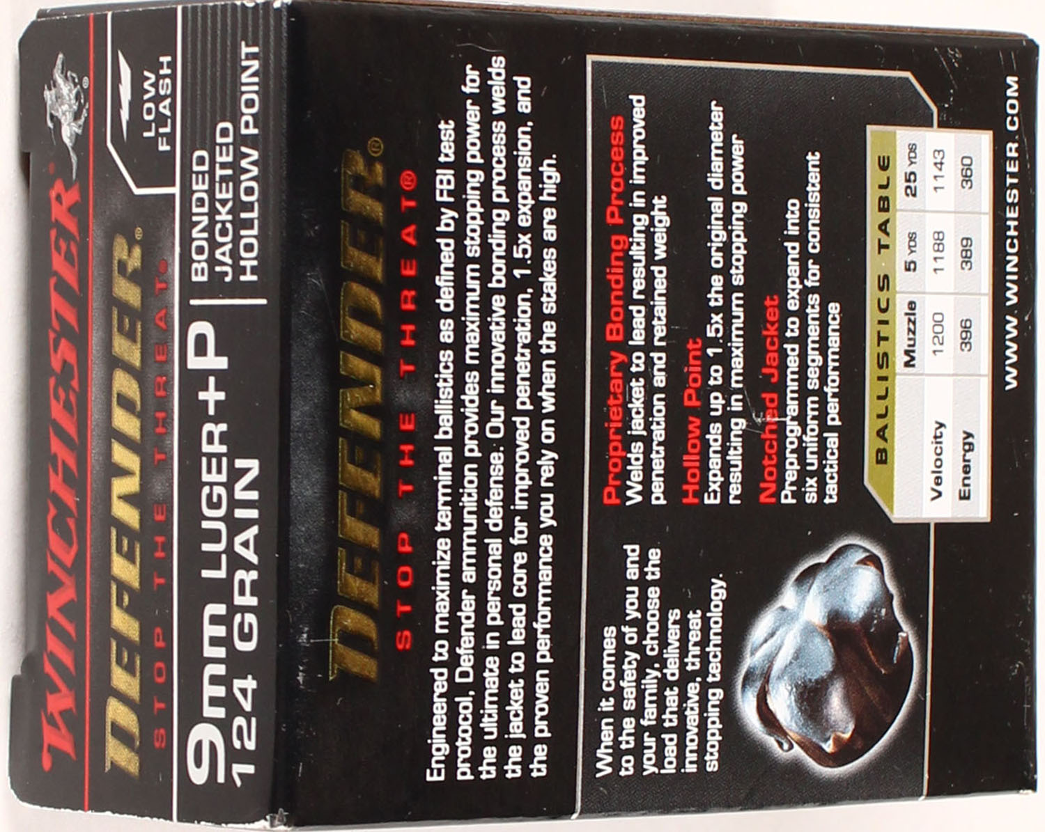 Winchester, Defender, 9mm Luger +P, 124 Grain Bonded Jacketed HP, Full, 1pc., Multi-colored box, box is solid with great color, Ammo is excellent. Grade: Excellent + - Value: 20 to 80