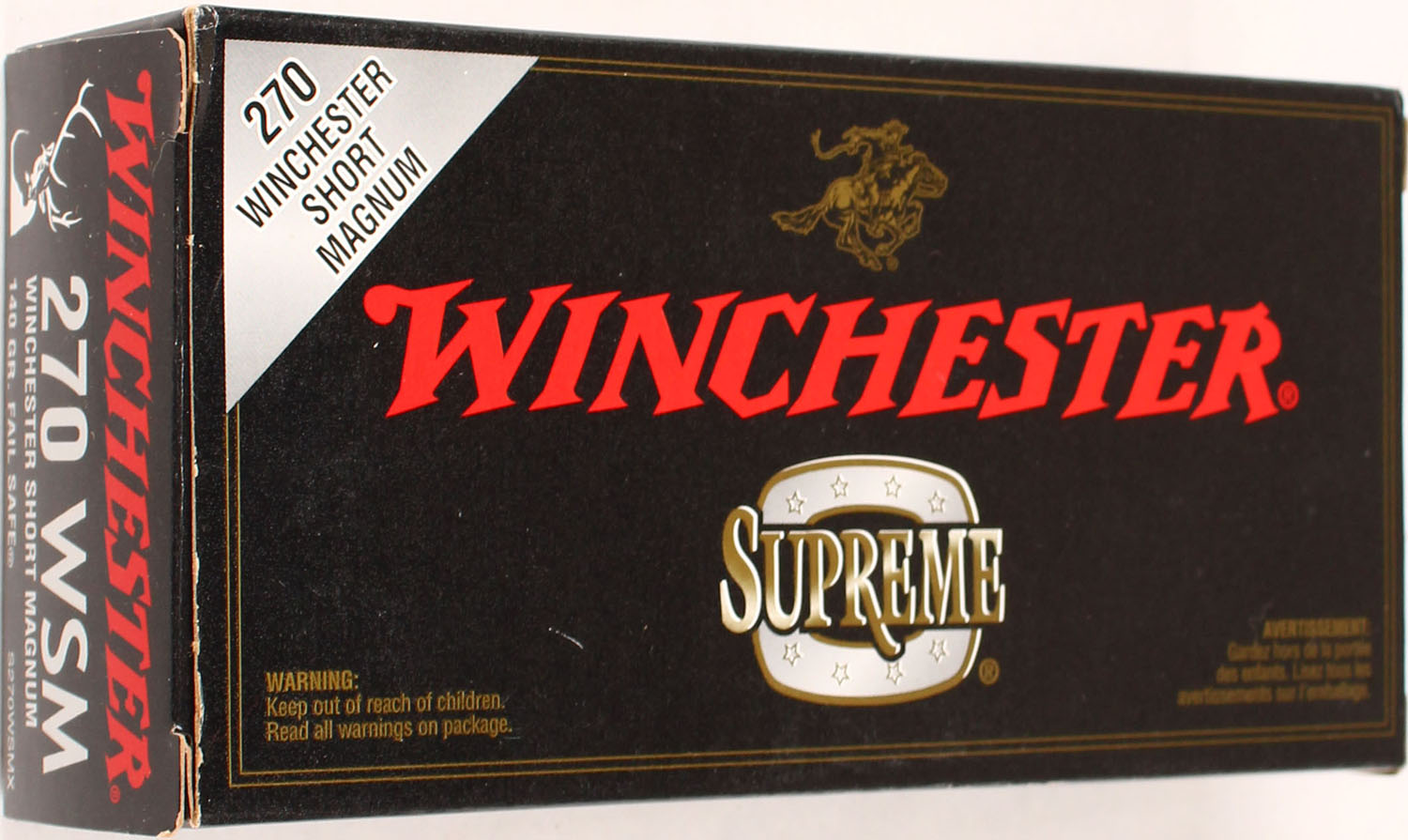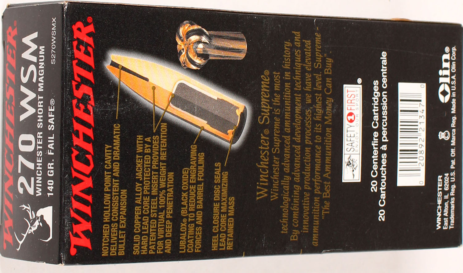 Winchester, Supreme, 270 WSM, 140 Grain Fail Safe, Full, 1pc., Multi-colored box, box is solid with great color, Ammo is excellent. Grade: Excellent + - Value: 20 to 80