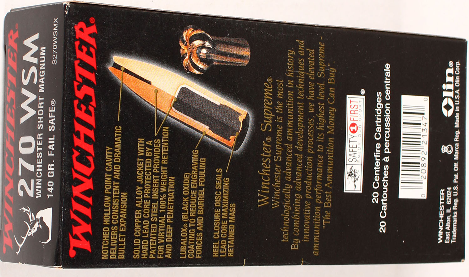 Winchester, Supreme, 270 WSM, 140 Grain Fail Safe, Full, 1pc., Multi-colored box, box is solid with great color, Ammo is excellent. Grade: Excellent + - Value: 20 to 80