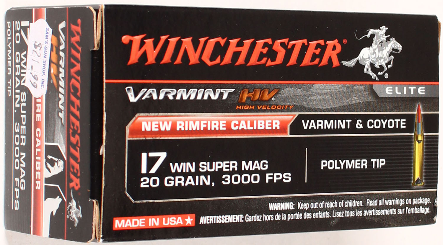 Winchester Elite, Varmint, 17 Win Super Mag, 20 Grain High Velocity Polymer Tip, Full, 1pc., Multi-colored box, box is solid with great color, Ammo is excellent. Grade: Excellent + - Value: 20 to 80