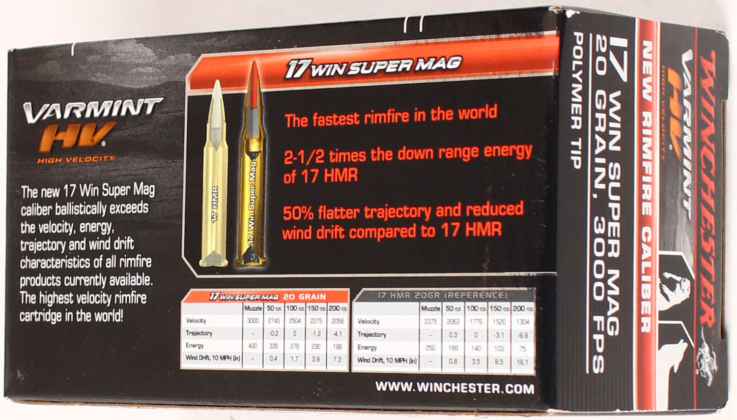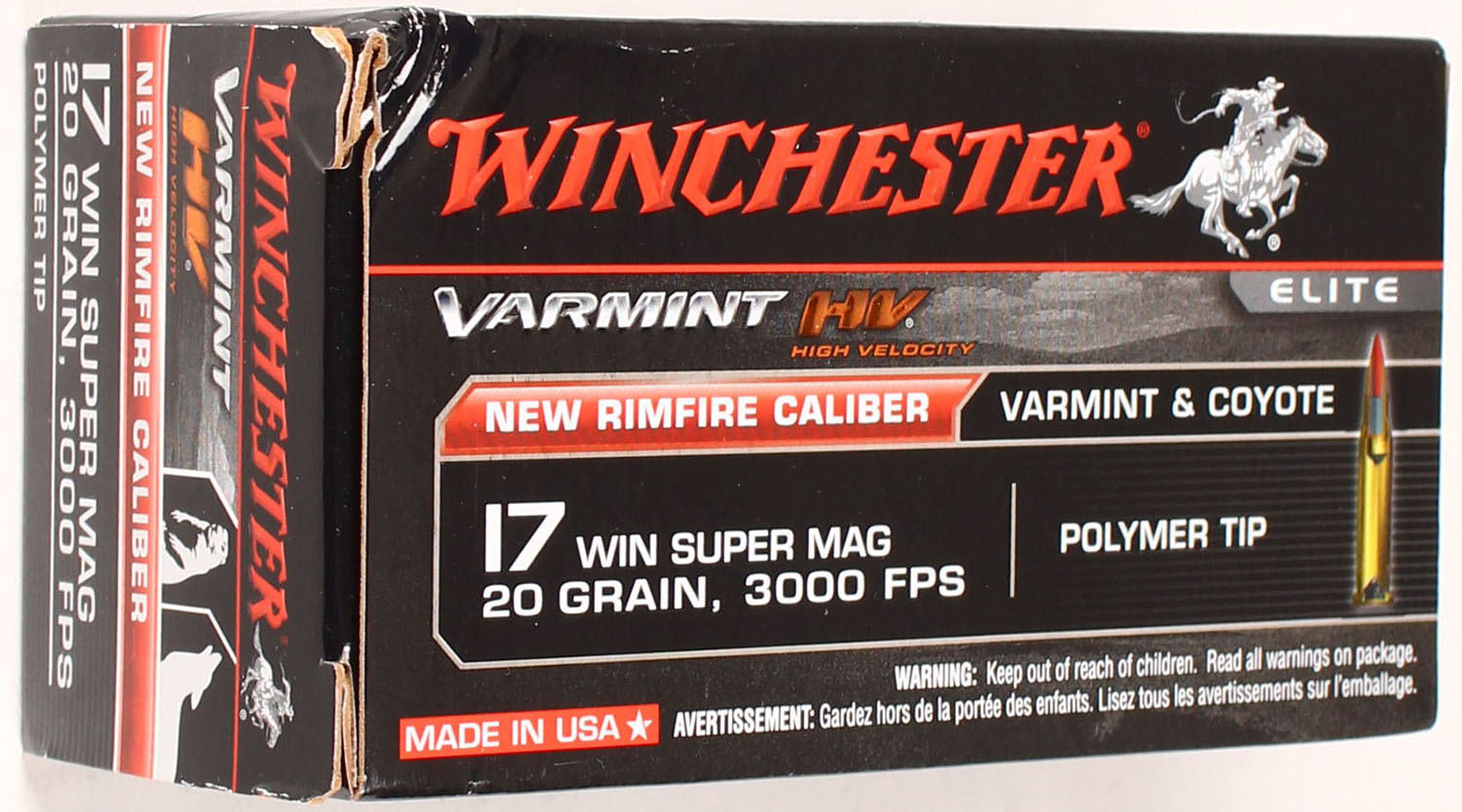 Winchester Elite, Varmint, 17 Win Super Mag, 20 Grain High Velocity Polymer Tip, Full, 1pc., Multi-colored box, box is solid with great color, Ammo is excellent. Grade: Excellent + - Value: 20 to 80