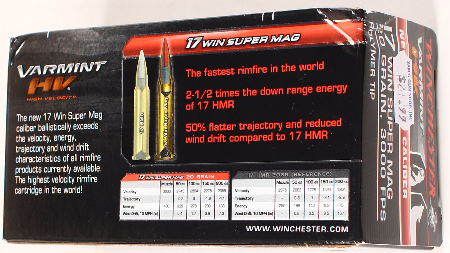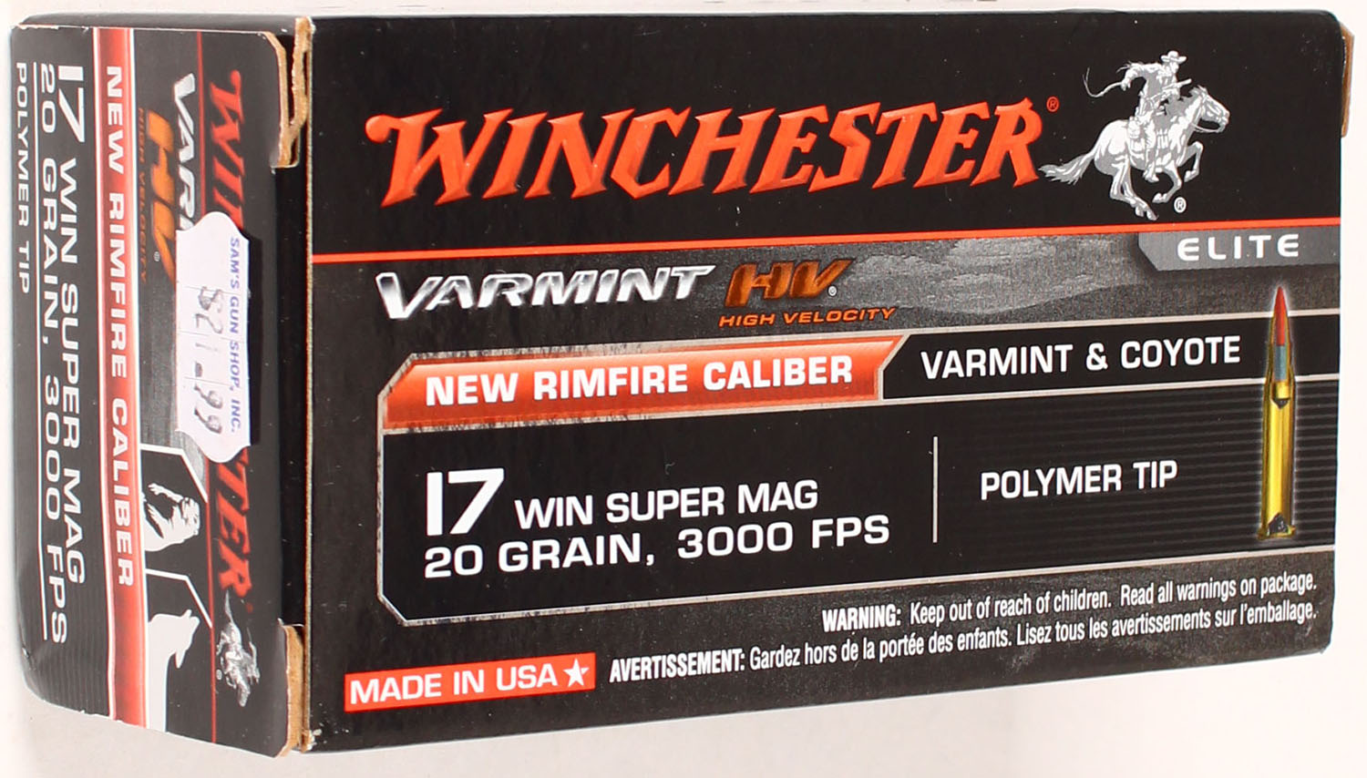 Winchester Elite, Varmint, 17 Win Super Mag, 20 Grain High Velocity Polymer Tip, Full, 1pc., Multi-colored box, box is solid with great color, Ammo is excellent. Grade: Excellent + - Value: 20 to 80