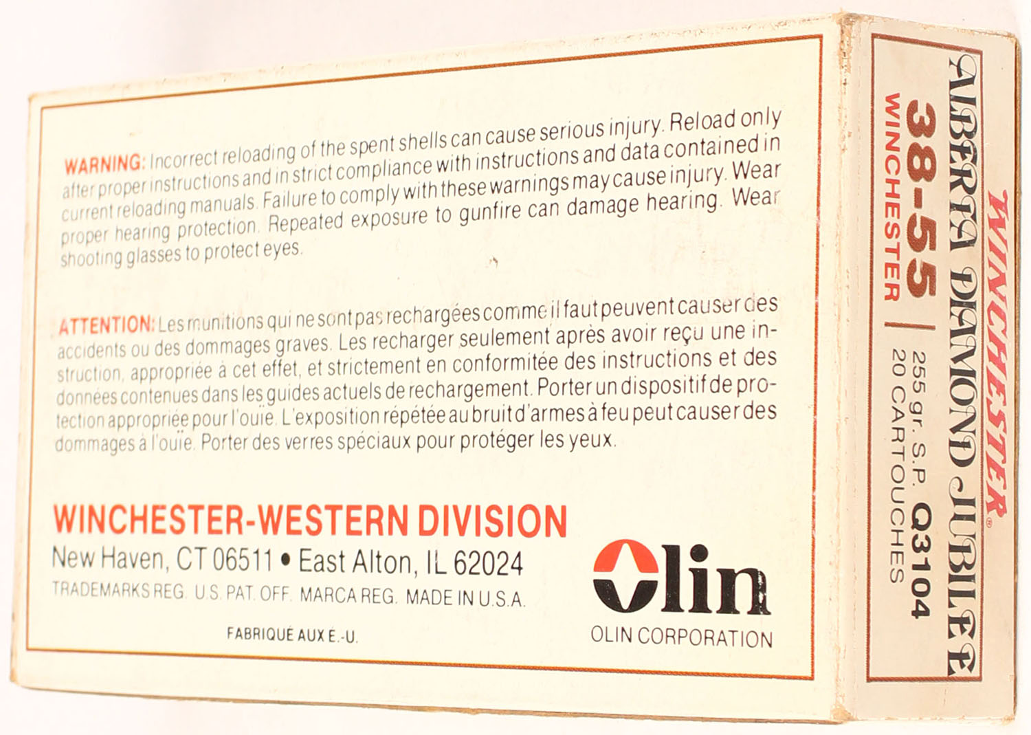 Winchester, Alberta Diamond Jubilee, 38-55 Win, 255 Grain SP, Full, 1pc., Multi-colored box, box is solid with great color, Ammo is excellent. Grade: Excellent + - Value: 20 to 100