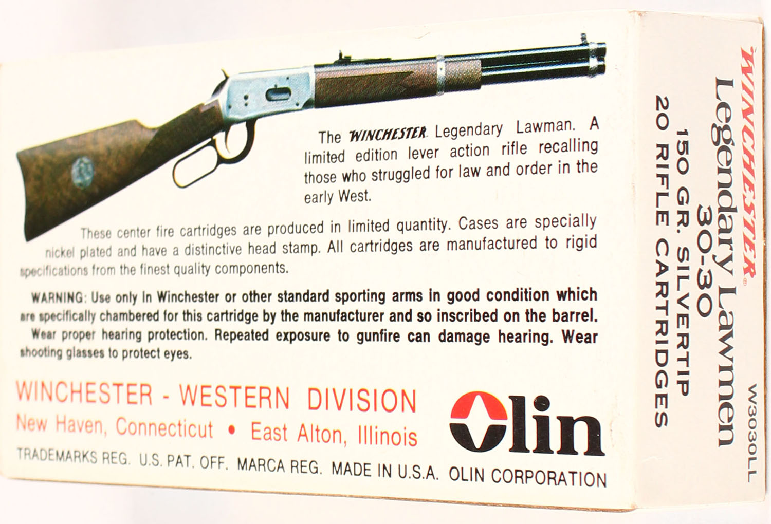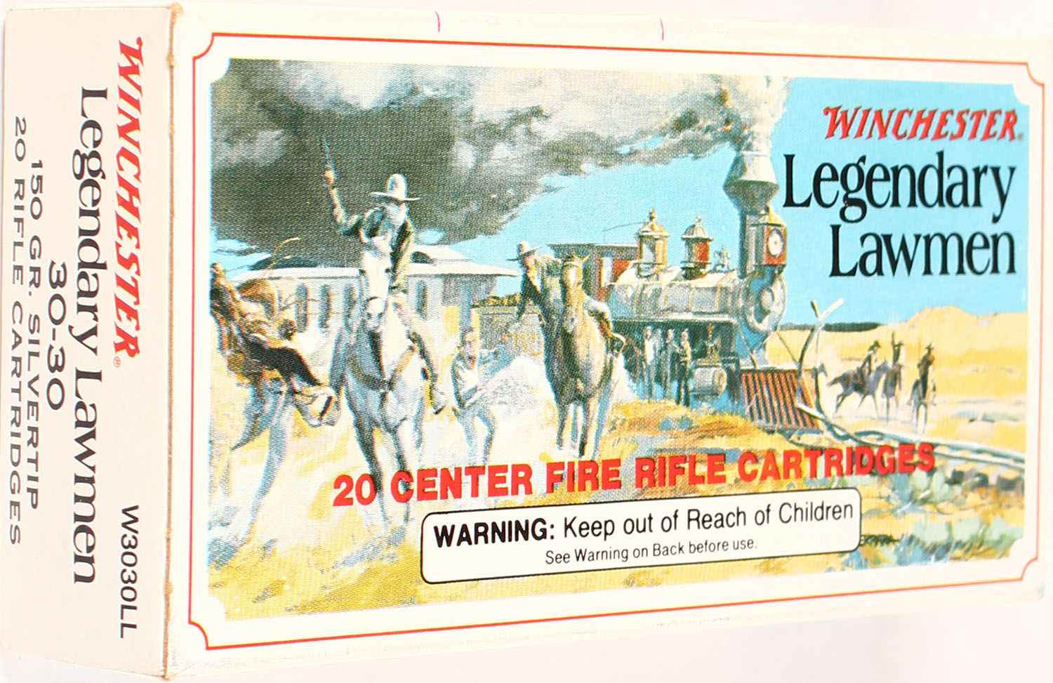 Winchester, Legendary Lawmen, 30-30, 150 Grain Silvertip, Full, 1pc., Multi-colored box, box is solid with great color, Ammo is excellent. Grade: Excellent ++ - Value: 20 to 100