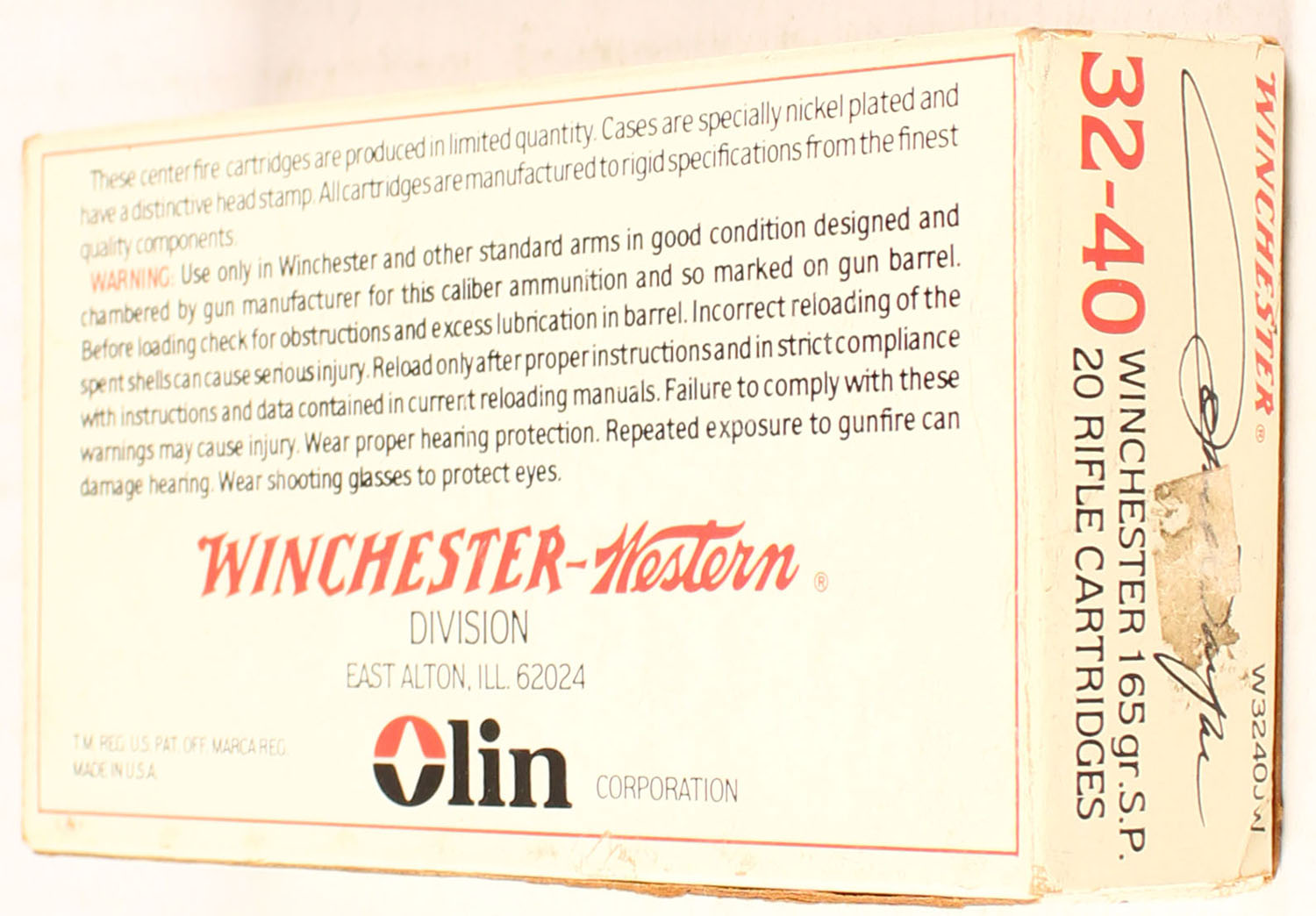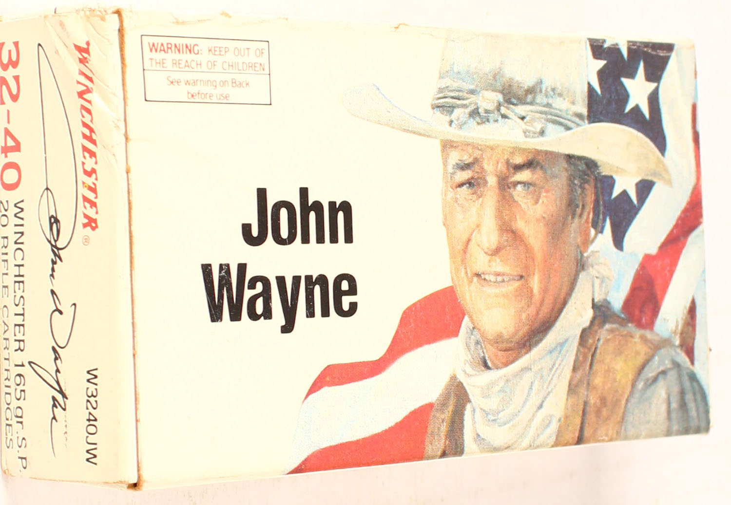 Winchester, John Wayne, 32-40 Win, 165 Grain SP, Full, 1pc., Multi-colored box, box is solid with great color, Ammo is excellent. Grade: Excellent + - Value: 20 to 100