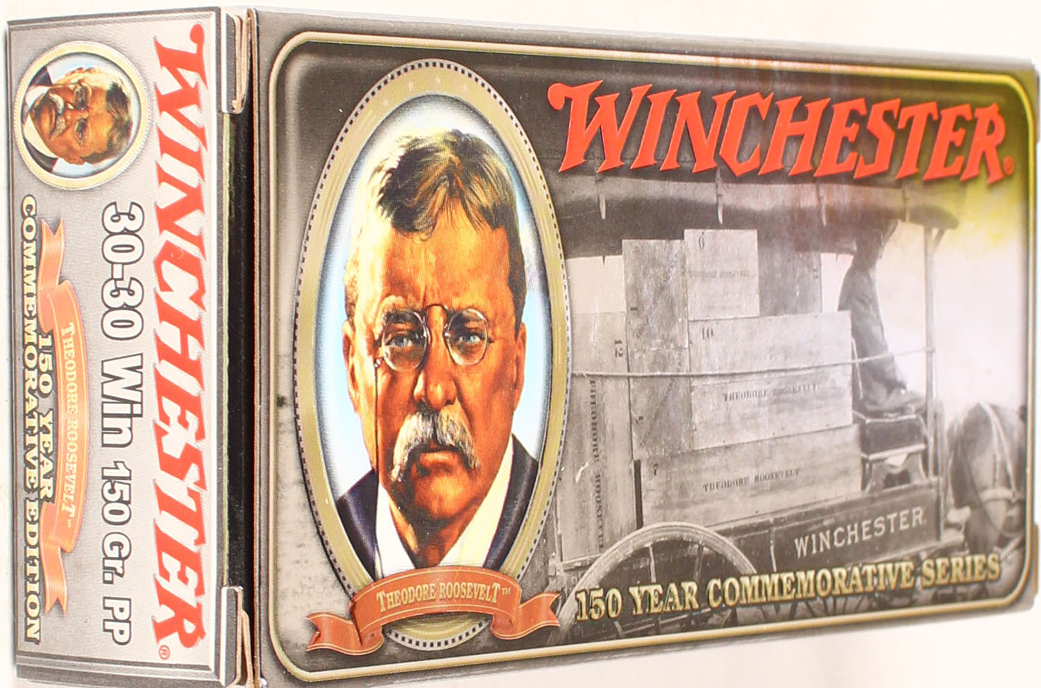 Winchester, Theodore Roosevelt 150 Year Commemorative Series, 30-30 Win, 150 Grain PP, Full, 1pc. Silver box featuring the 26th president, box is near mint but has sticker to bottom with excellent to minty color, ammo is excellent to minty. Grade: Excellent ++ - Value: 20 to 100