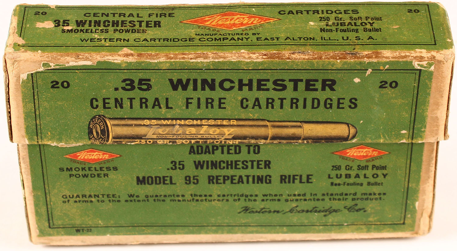 Western, .35 Winchester (35 WCF), 250 Gr. Soft point LUBALOY Bullet, Smokeless, 2pc., Full, buff box with green label & black/red print, box is solid with rub marks & edge wear, ammo ranges from very good to good. Grade: Excellent - Value: 80 to 200