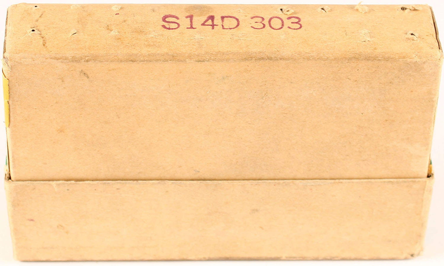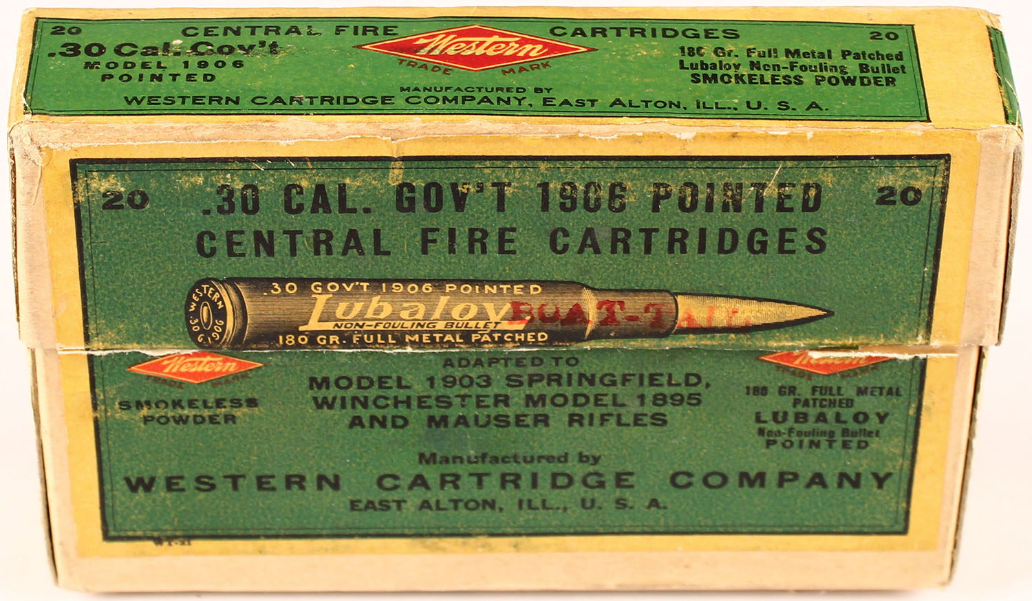 Western, .30 Cal. Gov't model 1906 (30-06), OVER STAMPED ''BOAT-TAIL'' on bullet, 180 Gr. Full Metal patched LUBALOY Bullet, Smokeless, 2pc., Full, buff box with green label & black/red print, box is solid with wear/holes from bullets on bottom, rub marks & light edge/corner wear, ammo is good. Grade: Very Good ++ - Value: 80 to 160