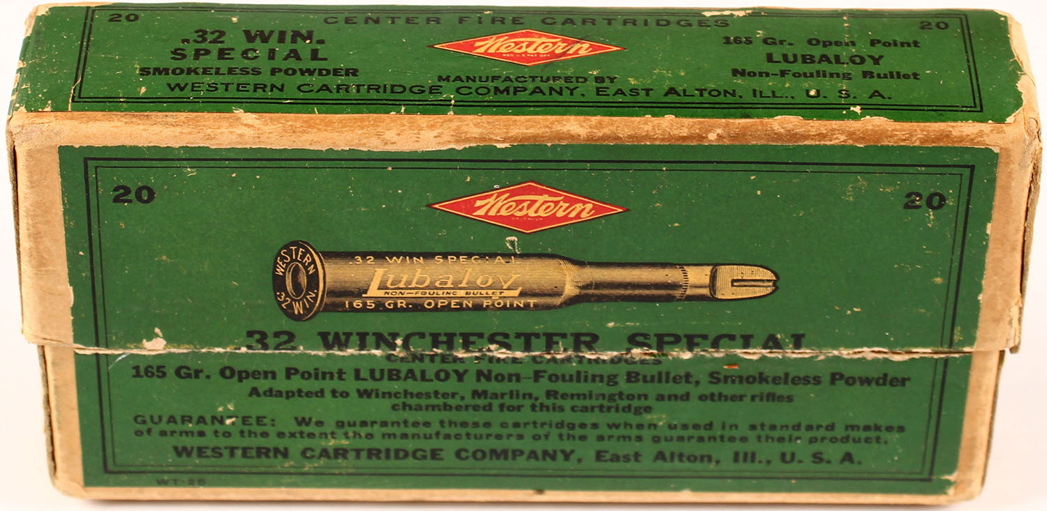 Western, .32 Winchester Special, 165 Gr. Open Point LUBALOY Bullet, Smokeless, 2pc, Full, buff box with green label & black/red print, box is solid with pencil marks on back, light rub marks & light edge/corner wear, ammo ranges from very good to good. Grade: Excellent - Value: 50 to 150