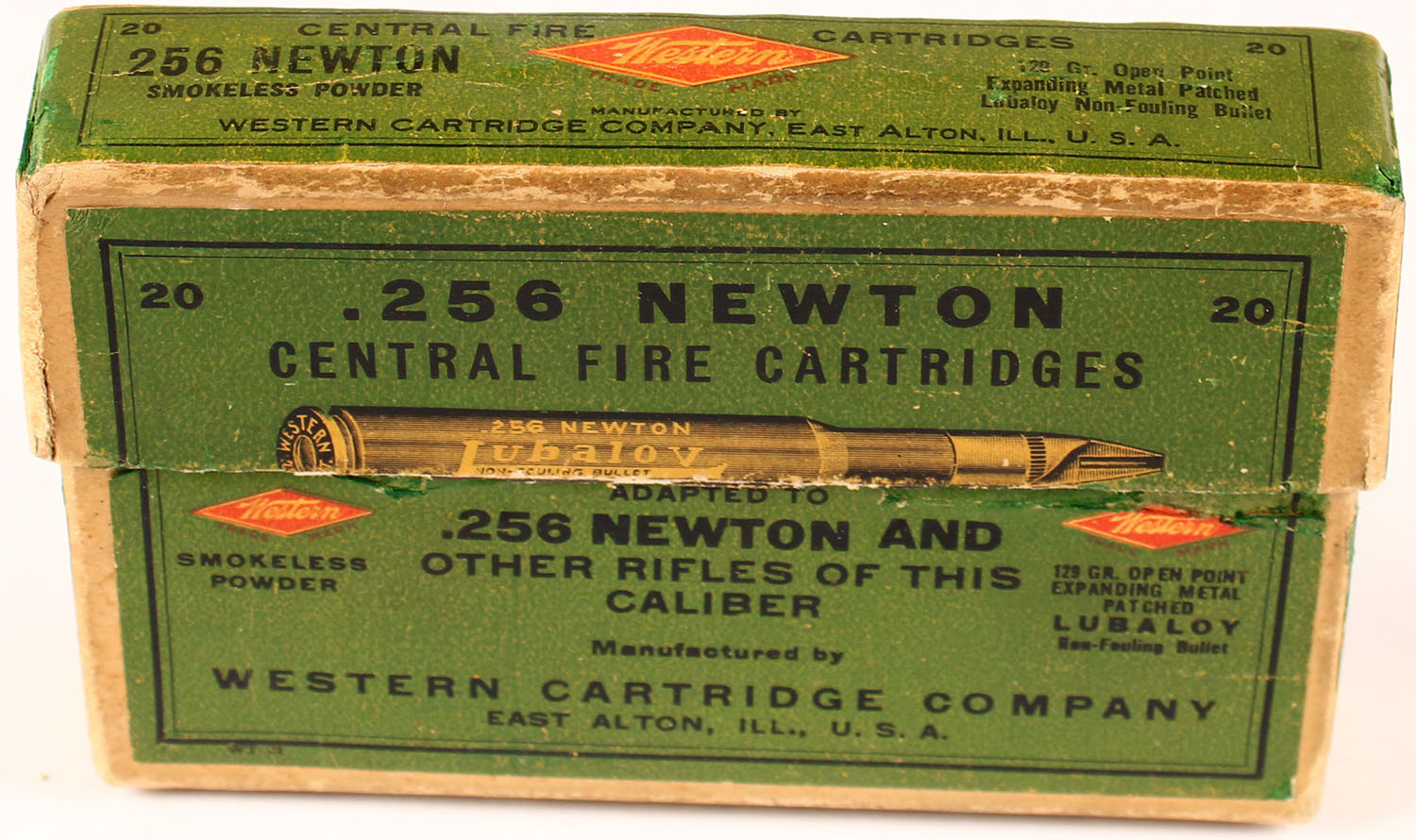 Western, .256 Newton, 129 Gr. Open Point Expanding Metal Patched bullet, smokeless, 2pc, Partial 16 Rds. Of soft point ammo & With one Rd. of unprimed fired rd., buff box with green label & black/red print, box is solid with rub marks, & edge wear, ammo is very good. Grade: Excellent - Value: 50 to 100