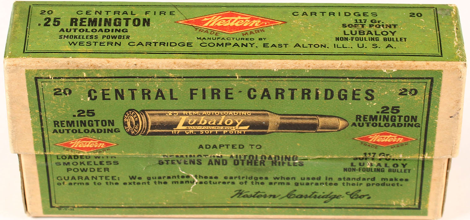 Western, .25 Remington Autoloading, 117 Gr. Soft Point LUBALOY Bullet, smokeless, stamp on bottom in black that reads, ''S17J 20D='', 2pc, FULL & SEALED, buff box with green label & black/red print, box is solid with rub marks, & light edge/corner wear. Grade: Excellent - Value: 100 to 300
