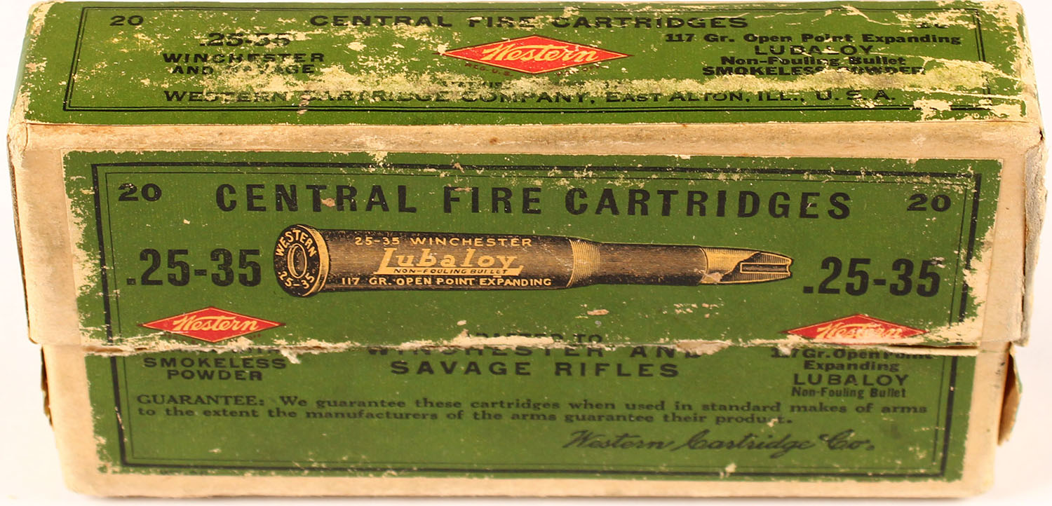 Western, .25-35 Winchester, 117 Gr. Open Point Expanding LUBALOY Bullet, Smokeless, Double stamped marking in purple on bottom of box that reads, ''55U17H155='', 2pc, Full, buff box with green label & black/red print, box is solid with rub marks & edge/corner wear, ammo ranges from very good to good. Grade: Very Good ++ - Value: 50 to 150