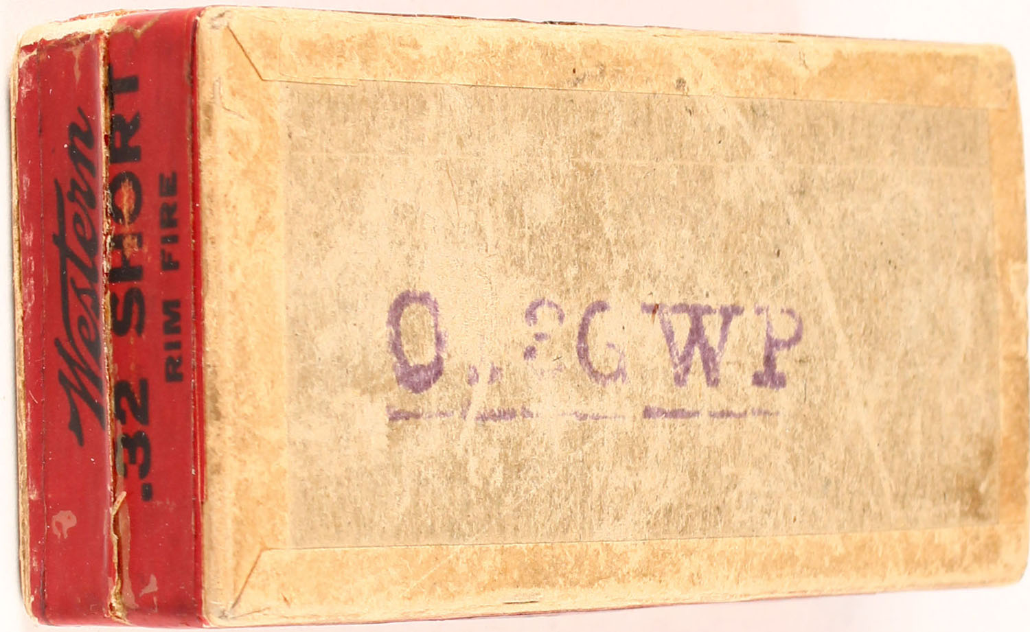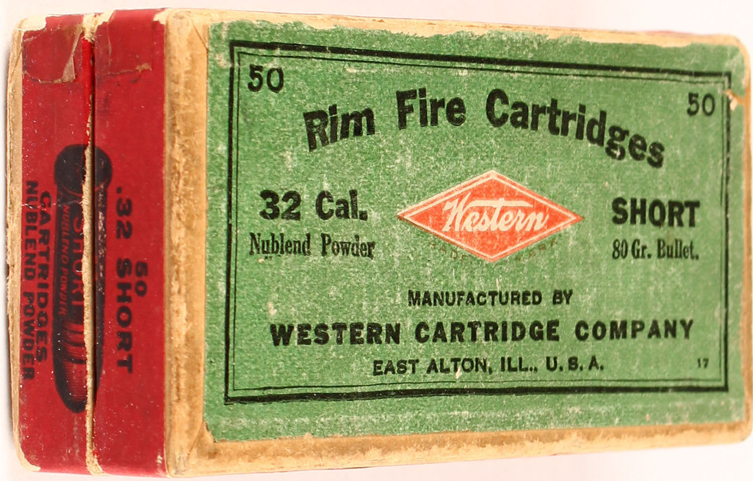 Western, .32 Short, Rim Fire, 80 Gr. Bullet, Nublend powder, 2pc, Full, buff box with green/red label & black print, box is solid with tape, rub marks, & light edge wear, ammo is good. Grade: Very Good ++ - Value: 50 to 150