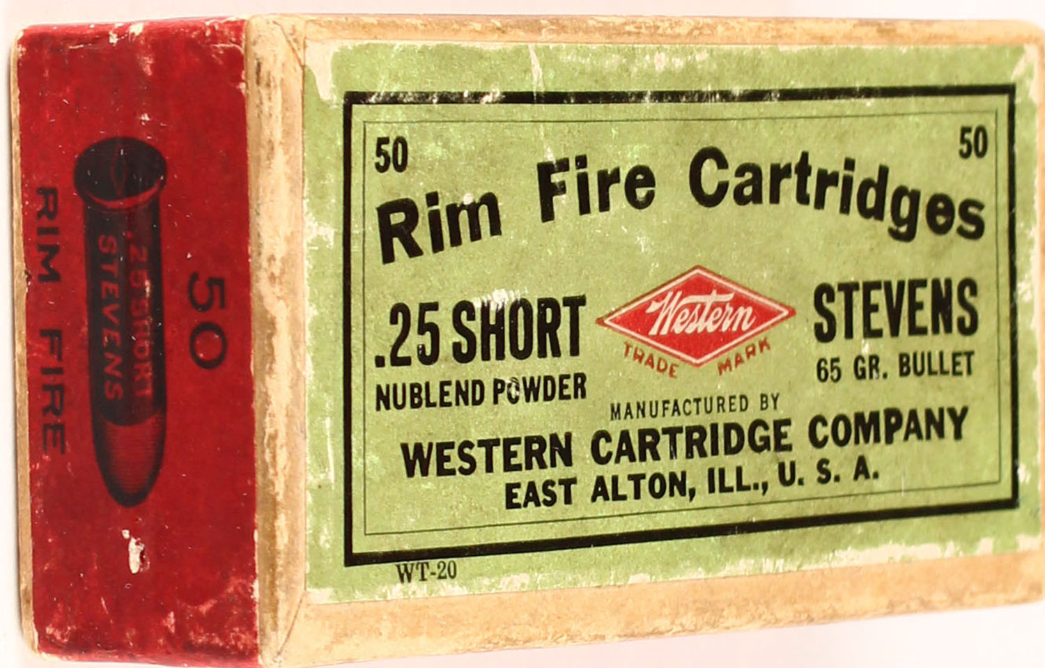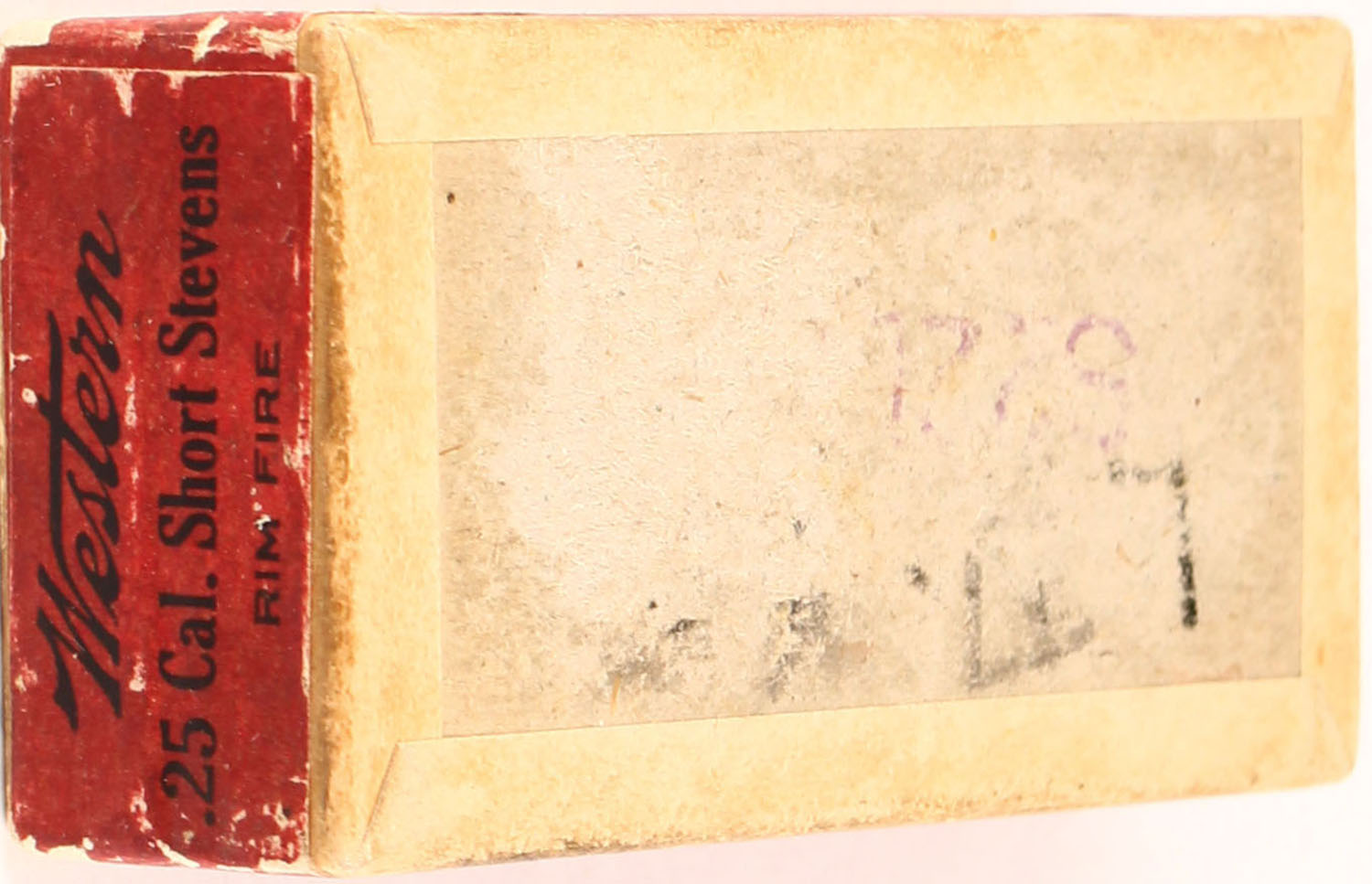 Western, .25 short Stevens, Rim Fire, 65 Gr. Bullet, Nublend powder, 2pc, FULL & SEALED, buff box with green/red box & black print, box is solid with rub marks, edge wear, & sticker mark on bottom. Grade: Very Good ++ - Value: 50 to 150
