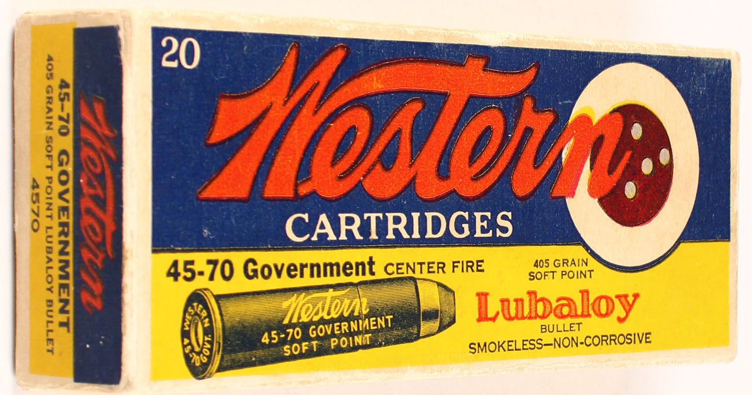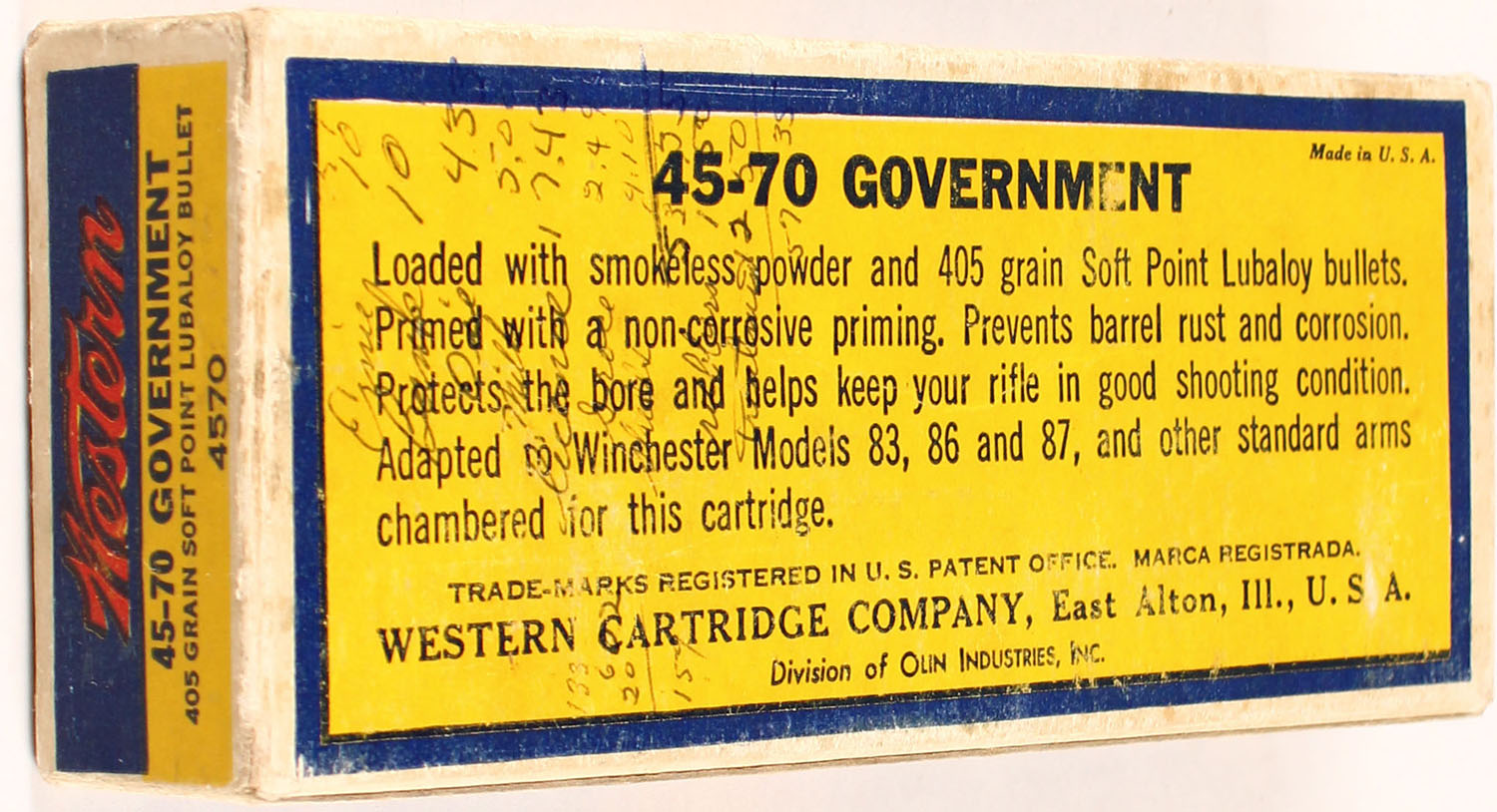 Western, Bullseye, .45-70 Government, 405 Gr. Soft Point LUBALOY Bullet, Smokeless, 1pc, Full, buff box with blue/yellow label & black/red print, box is solid with pen marks on back, light rub marks, & light edge wear, ammo is excellent. Grade: Excellent - Value: 60 to 120