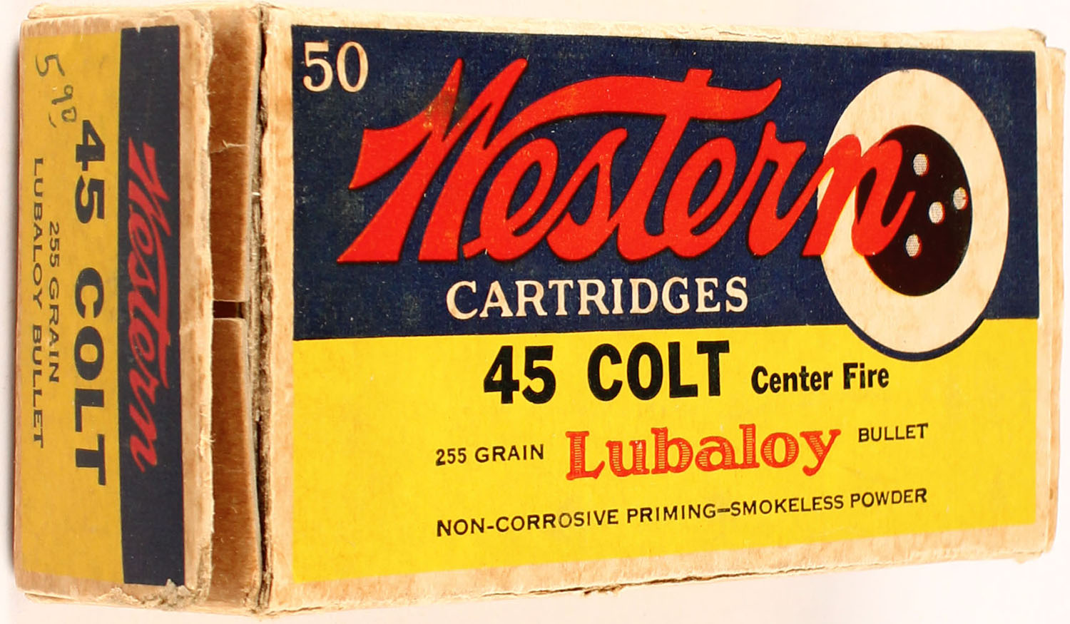 Western, Bullseye, .45 Colt, 255 Gr. LUBALOY Bullet, smokeless, Oilproof, 1pc, Full of modern ammo, buff box with blue/yellow label & black/red print, box has left end flap detached but still present, missing one inside end flap on right side & other inside flap is partially torn, right end flap has inside seam tape repair, pen marks, light rub marks & light edge wear, ammo is excellent. Grade: Very Good + - Value: 20 to 60