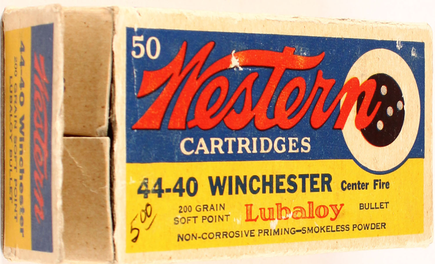 Western, Bullseye, .44-40 Winchester, 200 Gr. Soft Point LUBALOY Bullet, Smokeless, Oilproof, 1pc, Full, buff box with blue/yellow label & black print, box has left end flap detached but is still present, one partial tear in seam, rub marks, pen marks, & edge wear, ammo ranges from excellent to good. Grade: Very Good ++ - Value: 60 to 120