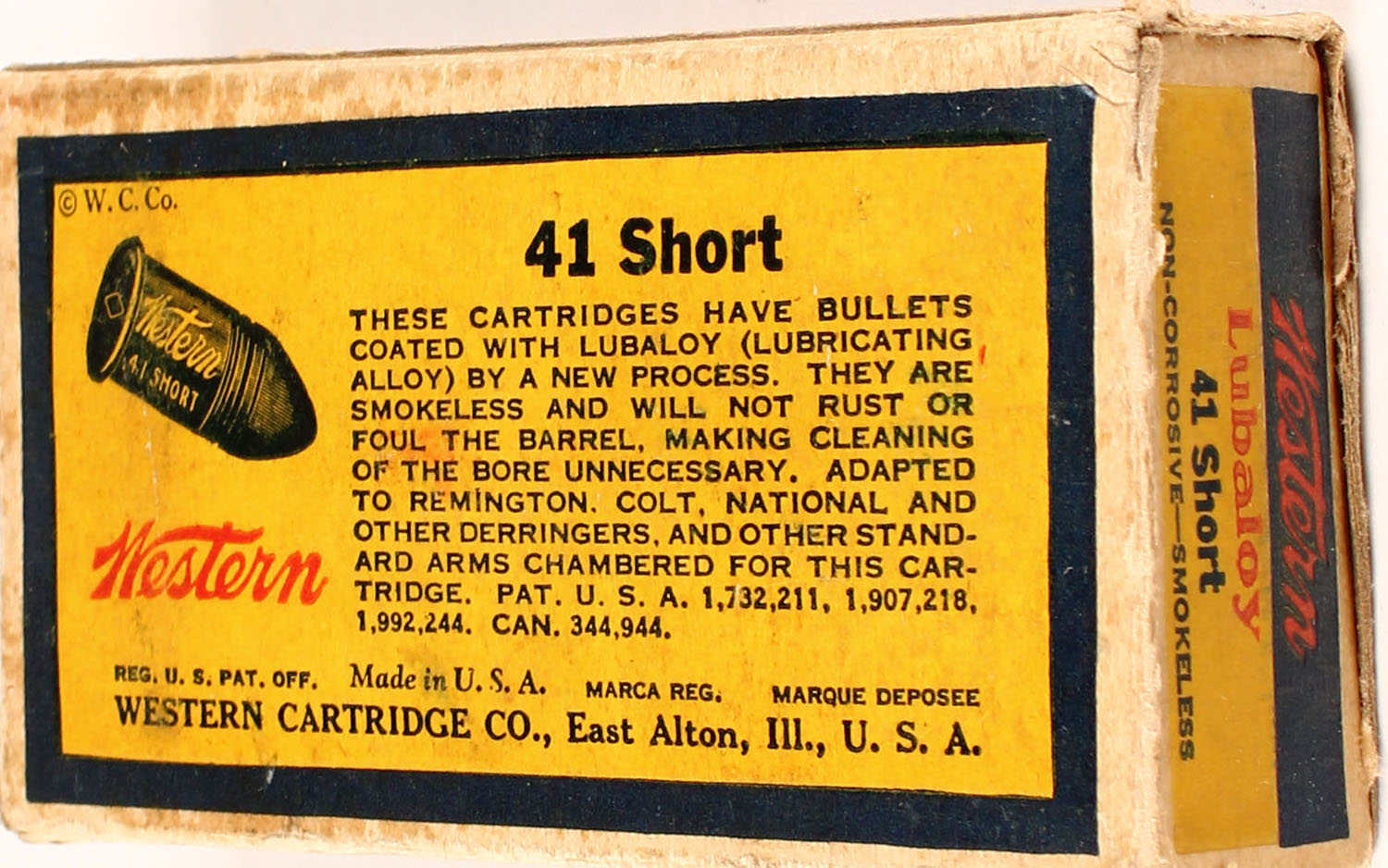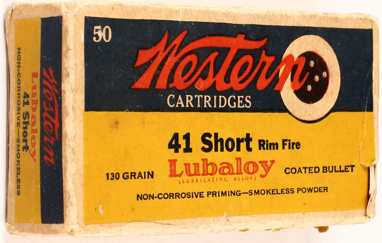 Western, Bullseye, .41 Short, 130 Grain Lubaloy Bullet, 1pc, Full with one Rd. of lead not jacketed,. Blue yellow & red bulls eye box, box is solid with light age soiling, light handling wear, & edge wear, ammo is excellent. Grade: Excellent - Value: 40 to 100