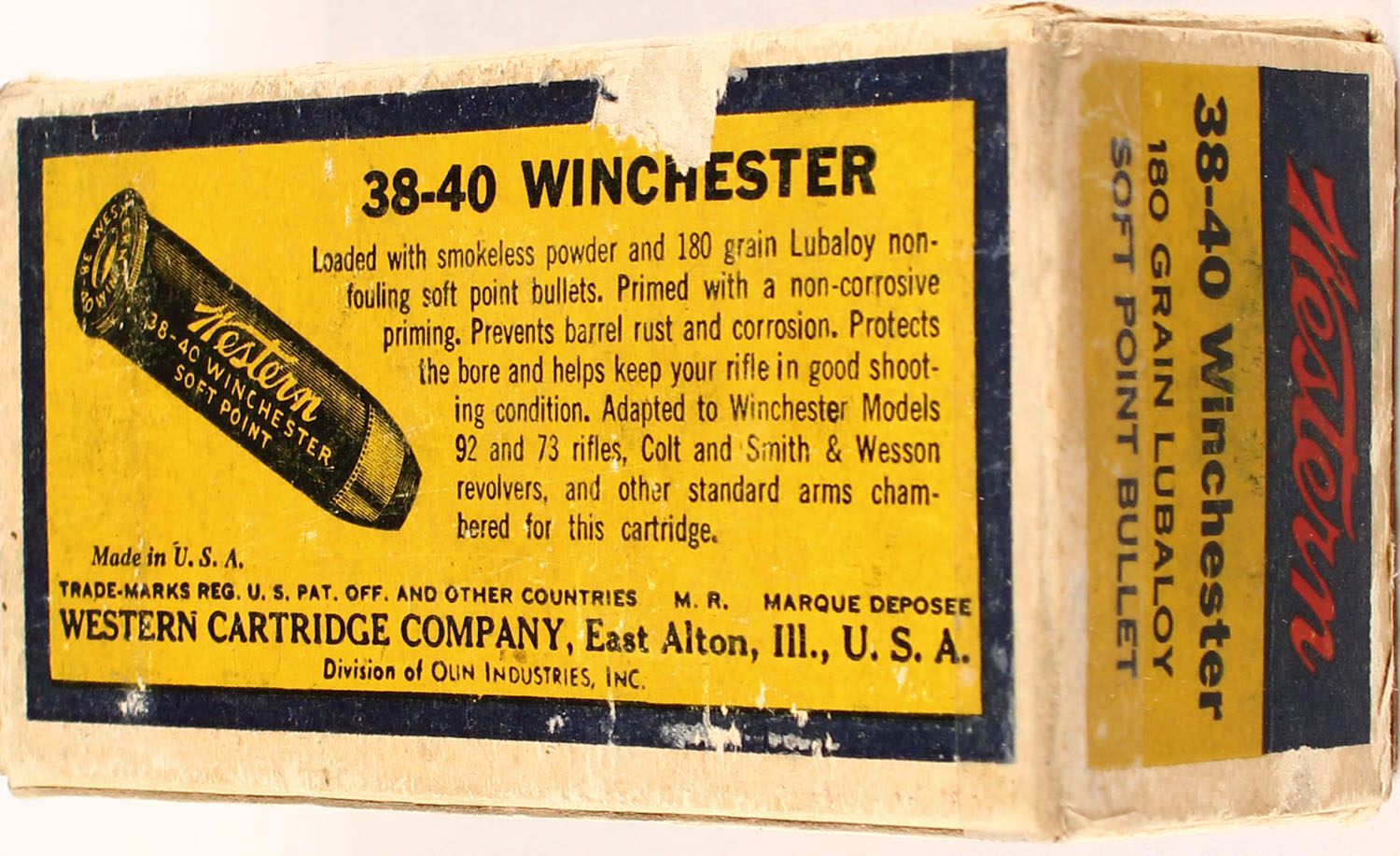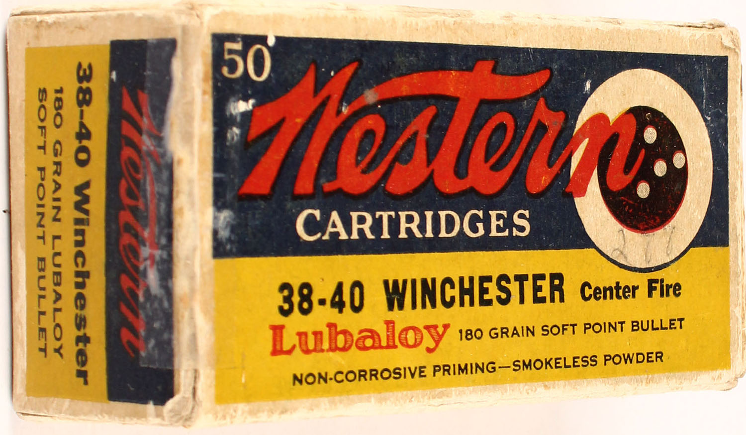 Western, Bullseye, .38-40 Winchester, 180 Grain Lubaloy Bullet, 1pc, Full, Blue yellow & red bulls eye box, box has 2 end flaps taped back on, sticker on tab of right end flap, light age soiling, pencil marks, small partial tears on seams, rub marks & edge/corner wear, ammo is excellent. Grade: Very Good - Value: 40 to 100