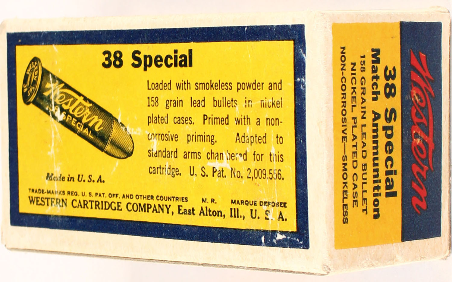 Western, Bullseye, .38 Special Match, 158 Gr. Lead Bullet, Nickel Plated case, Smokeless, 1pc, Full, white box with blue/yellow label & black/red print, box is solid with light rub marks, & light edge wear, ammo is very good. Grade: Excellent + - Value: 20 to 100