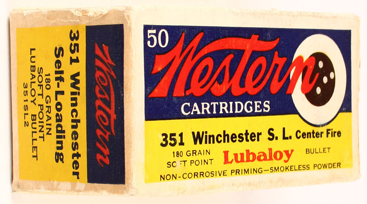 Western, .351 Winchester S.L., 180 Grain Lubaloy Bullet, FULL, 1Pc., Blue yellow & red bulls eye box, box has some scuffing, ammo is excellent. Grade: Excellent - Value: 100 to 300