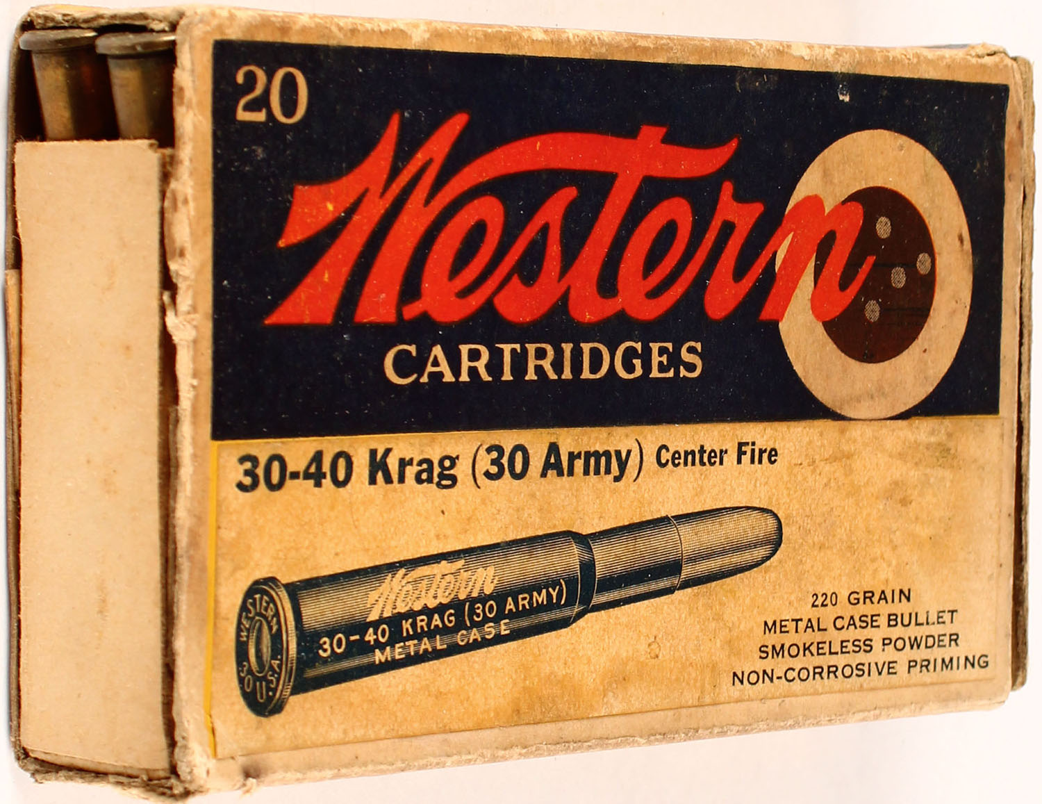 Western, .30-40 Krag(.30 Army), 220 Grain Lubaloy Bullet, FULL, 1Pc., Blue yellow & red bulls eye box, box has age soiling and some scuffing, both flaps are torn, ammo is very good. Grade: Good ++ - Value: 10 to 50